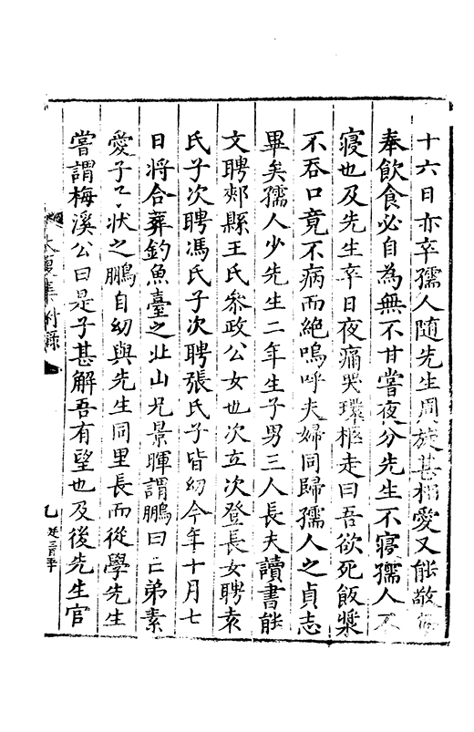 十六日亦卒孺人随先生周旋甚相愛又能敬每奉飲食必自為無不甘嘗夜分先生不寢孺人不寢也及先生卒日夜痛哭環柩走曰吾欲死飯漿不吞口竟不病而絶嗚呼夫婦同歸孺人之貞志畢矣孺人少先生二年生子男三人長夫讀書能文聘郟縣王氏叅政公女也次立次登長女聘袁氏子次聘馮氏子次聘張氏子皆幼今年十月七日将合葬釣魚臺之北山兄景暉謂鵬曰亡弟素愛子子状之鵬自幼與先生同里長而從學先生嘗謂梅溪公曰是子甚解吾有望也及後先生官