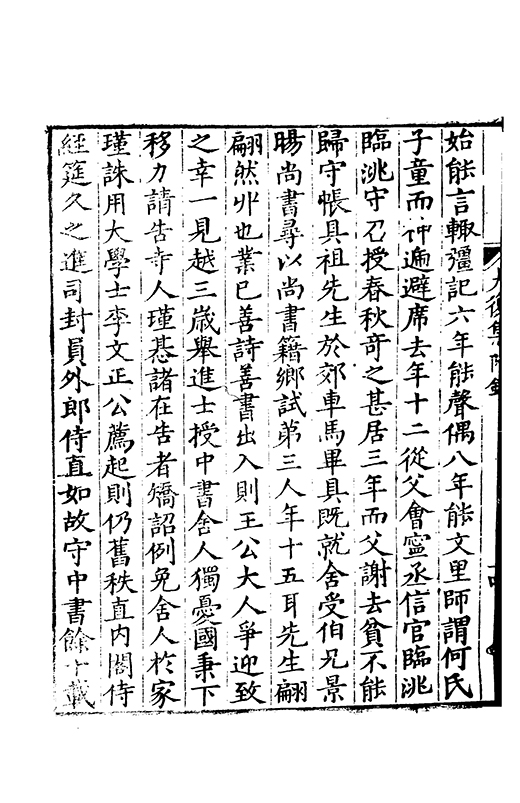 始能言輒彊記六年能聲偶八年能文里師謂何氏子童而神逓避席去年十二從父會寍丞信官臨洮臨洮守召授春秋竒之甚居三年而父謝去貧不能歸守帳具祖先生於郊車馬畢具既就舍受伯兄景暘尚書尋以尚書籍鄉試第三人年十五耳先生翩翩然丱也業已善詩善書出入則王公大人爭迎致之幸一見越三嵗舉進士授中書舍人獨憂國秉下移力請告寺人瑾惎諸在告者矯詔例免舍人扵家瑾誅用大學士李文正公薦起則仍舊秩直内閣侍経筵久之進司封員外郎侍直如故守中書餘十載