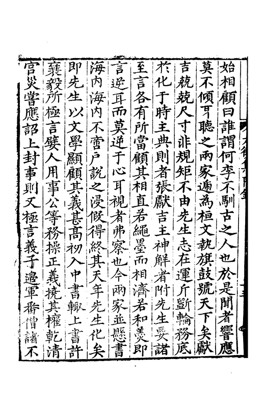 始相顧曰誰謂何李不馴古之人也於是聞者響應莫不傾耳聴之兩家逓為桓文執旗鼓號天下矣獻吉兢兢尺寸非規矩不由先生志在運斤斵輪務底扵化于時主典則者張獻吉主神觧者附先生要諸至言各有所當顧其相直若繩墨而相濟若和羹即言逆耳而莫逆于心耳視者弗察也今兩家並懸書海内海内不啻戸說之浸假得終其天年先生化矣即先生以文學顯顧其義甚高初入中書輙上書許襄毅所極言嬖人用事公等務操正義撓其權乾清宫災嘗應詔上封事則又極言義子邉軍番僧諸不