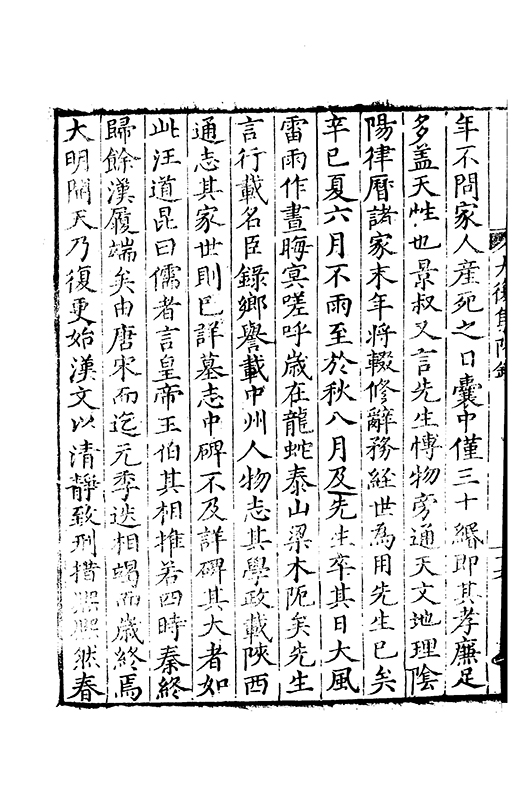 年不問家人産死之日囊中僅三十緡即其孝廉足多盖天性也景叔又言先生博物旁通天文地理隂陽律曆諸家末年将輟修辭務経世為用先生已矣辛巳夏六月不雨至於秋八月及先生卒其日大風雷雨作晝晦冥嗟乎嵗在龍蛇泰山梁木阨矣先生言行載名臣錄鄉譽載中州人物志其學政載陜西通志其家世則已詳墓志中碑不及詳碑其大者如此汪道昆曰儒者言皇帝王伯其相推若四時秦終歸餘漢履端矣由唐宋而迄元季迭相竭而嵗終焉大明開天乃復更始漢文以清靜致刑措熙熙然春