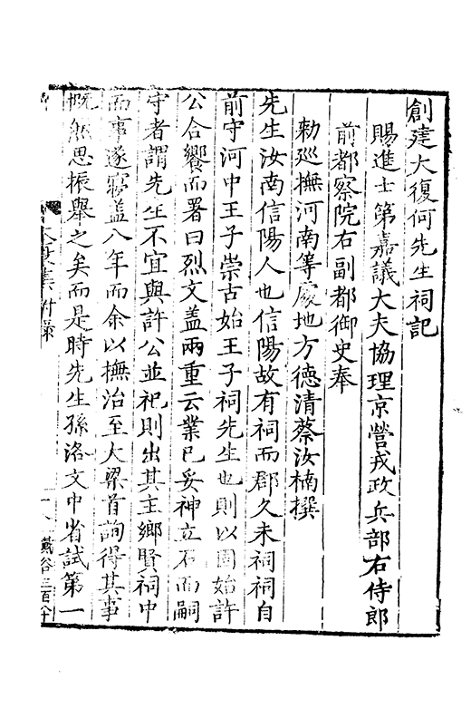 先生汝南信陽人也信陽故有祠而郡久未祠祠自前守河中王子崇古始王子祠先生也則以固始許公合饗而署曰烈文盖兩重云業已妥神立石而嗣守者謂先生不宜與許公並祀則出其主鄉賢祠中而事遂寢盖八年而余以撫治至大梁首詢得其事慨然思振舉之矣而是時先生孫洛文中省試第一