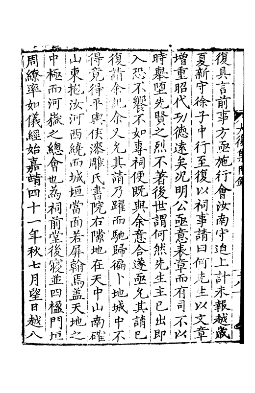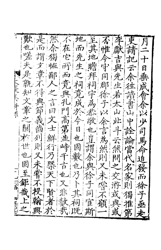 月二十日垂成會余以少司馬命迫發而徐子亟走吏請記云余徃讀書山中詮論當代名家則獨推第李獻吉與先生若太山北斗云然問之交游或與或否惟今守同郡徐子以余言為然則又未嘗不願一至其地瞻拜祠宇為恭敬也豈謂余與徐子同宦斯地而先生之祠竟成于今日也固數也乃卜其祠既不在它所而竟與孔門高第並峙千古也又非數哉然余獨恠鄙人之言曰文士鮮行乃槩天下賢者於是而謂文章不得與節義齒列則又未嘗不投翰興歎也嗟夫是孰知文章之關扵世也固至鉅哉上之
