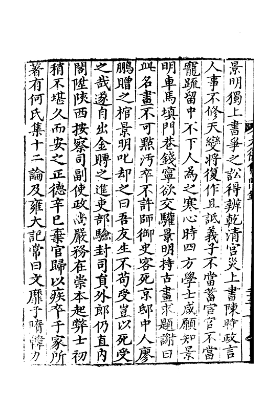景明獨上書爭之訟得辨乾清宫災上書陳時政言人事不修天變将復作且詆義子不當蓄宦官不當寵疏留中不下人為之寒心時四方學士咸願知景明車馬填門巷錢寜欲交驩景明持古畫求題謝曰此名畫不可點汚卒不許師御史客死京邸中人廖鵬贈之棺景明叱却之曰吾友生不茍受豈以死受之哉遂自出金賻之進吏部驗封司員外郎仍直内閣陞陜西按察司副使政尚嚴務在崇本起弊士初稍不堪久而安之正徳辛已棄官歸以疾卒于家所著有何氏集十二論及雍大記常曰文靡于隋韓力