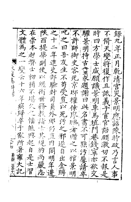 錄九年正月乾清宫災景明應詔陳時政乃言人事不脩天變将復作且詆義子宦官語頗激切不報是時四方學士咸願識景明車馬填門巷錢寜亦欲交驩景明持古畫求題謝曰此名畫不可點汚屢請卒不許師御史客死京邸權倖廖鵬者贈之以棺景明叱之曰吾友生不茍受豈以死汚之邪遂自出金賻之十二年進吏部驗封司員外郎仍直内閣明年遷陜西提學副使以經術世務敎諸士其規約尚嚴志在崇本起弊士初稍不堪久之幡然興起自是士習文體為之一變云十六年病歸卒于家所著雍大記