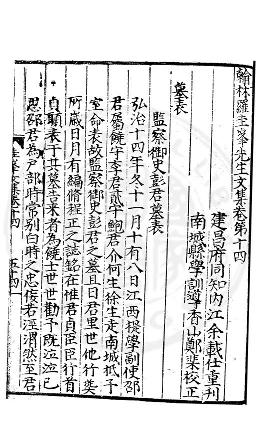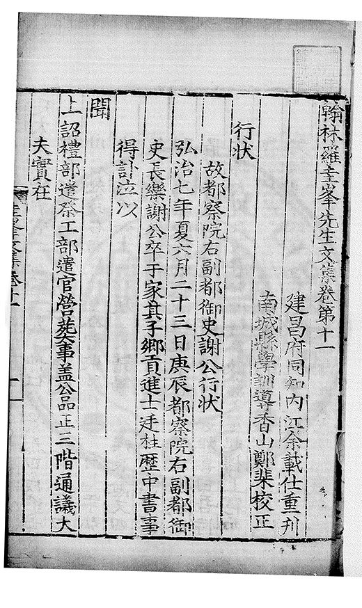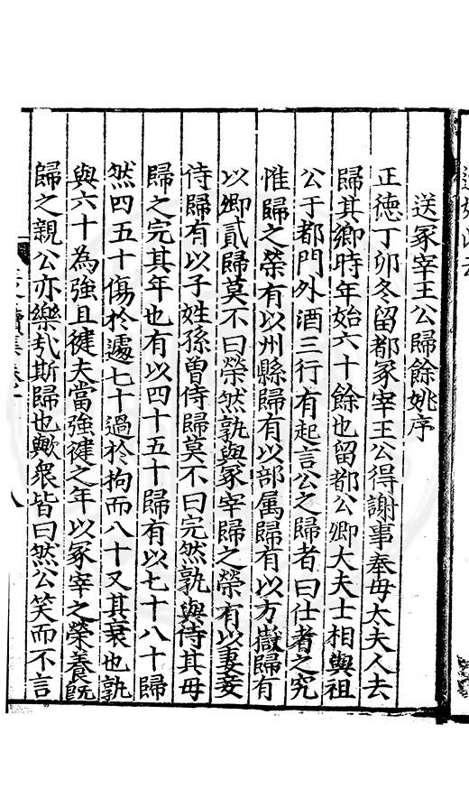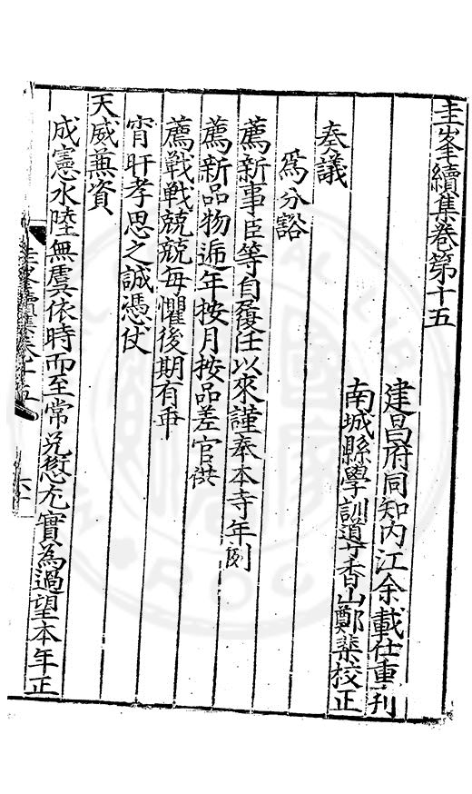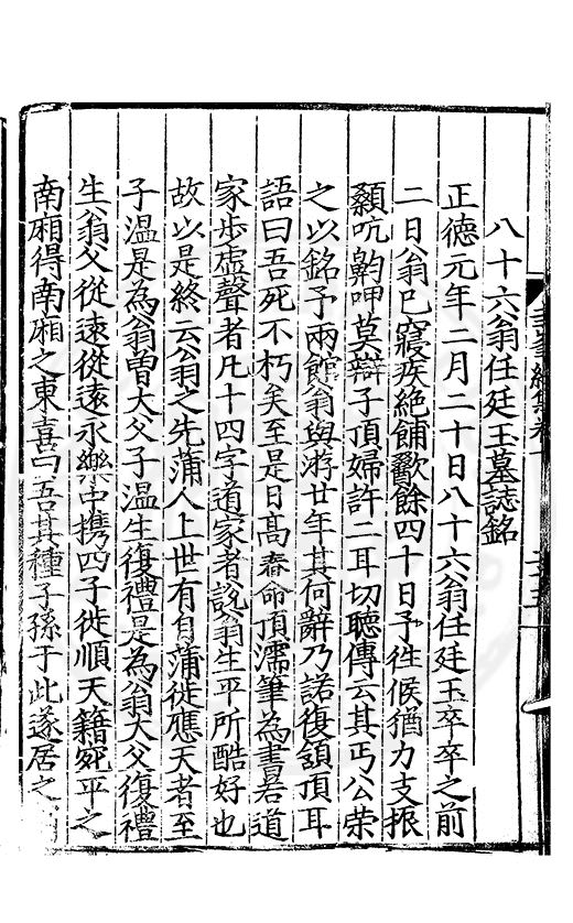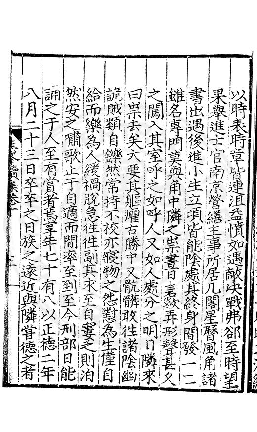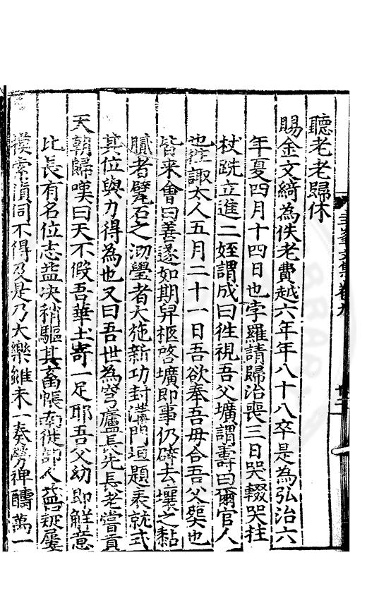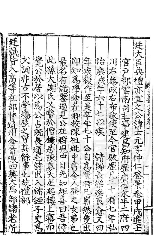 為乞恩休致以全殘喘事臣年六十六歳原籍江西建昌府南城縣人由進士除前任不開外南京太常寺少卿欽陞本寺卿正徳四年六月二十四日到任又自本寺卿欽陞南京吏部右侍郎正徳五年十月十六日到任通理前任扣該正徳七年五月二十三日三年考滿縁臣自