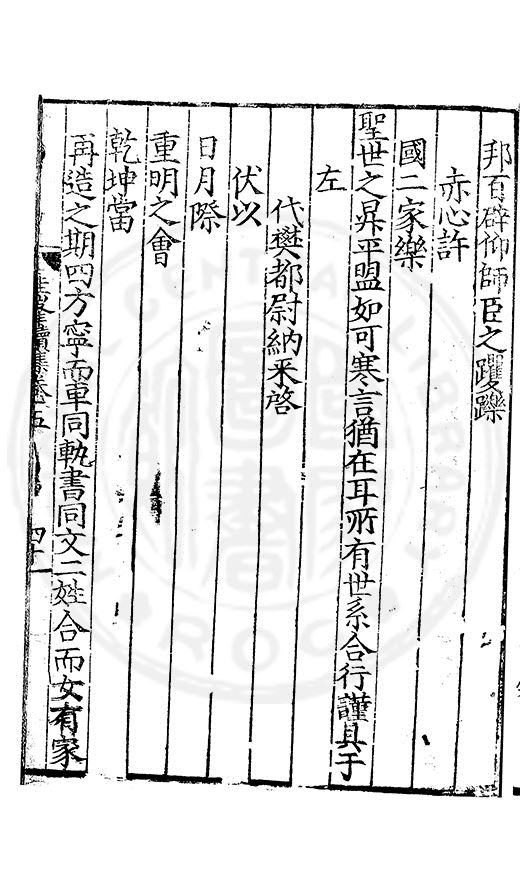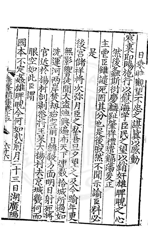 日乗時觀望不忠之謀冀以感動宸衷即賜施行以慰海宇臣民之望以銷奸雄睥睨之心然後螽斯衍慶麟趾肇祥禮遣歸藩爰正主鬯臣雖譴死固其分也是後寂然不聞示諭臣料必是後宫儲祥將次弥月臣之私喜旦夕望之及今踰年更無影響徒聞大盗並興遍布天下連数拾城所過如洗運河两岸焚刼殆空前日縳殺方面明日射死將官近扵楊村剖剥叅將王昶大楊村去京城幾何而眼空如此臣謂國本不定姦雄睥睨今何如哉前月二十三日湖廣陽
