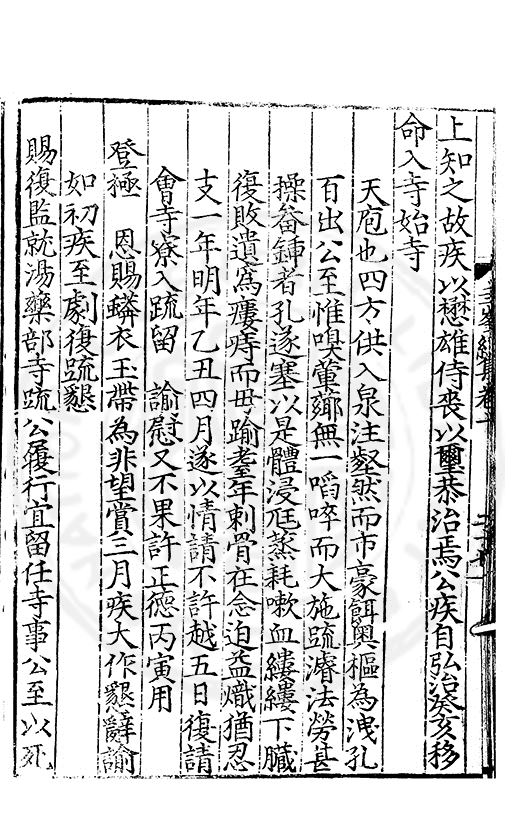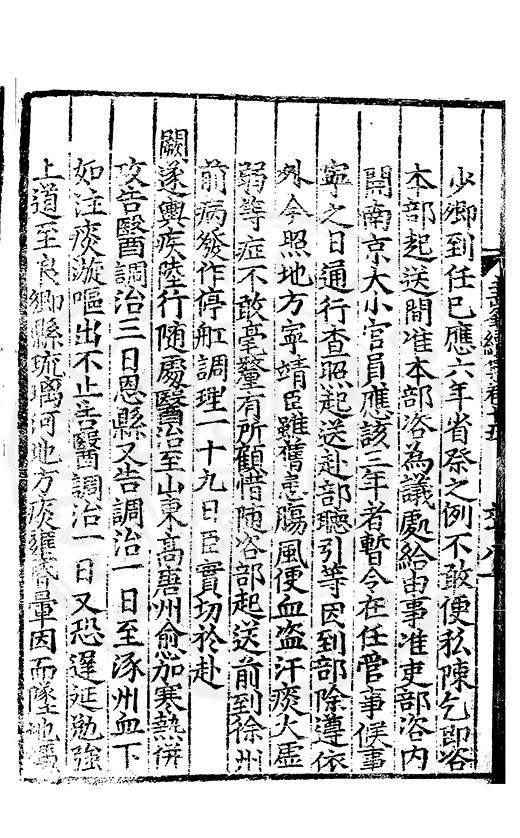 少卿到任巳應六年省祭之例不敢便私陳乞即咨本部起送間准本部咨為議處給由事准吏部咨内開南京大小官員應該三年者暫令在任管事候事寕之日通行查照起送赴部聴引等因到部除遵依外今照地方寕靖臣雖舊患膓風便血盗汗痰火虛弱等症不敢毫釐有所顧惜随咨部起送前到徐州前病發作停舡調理一十九日臣實切扵赴闕遂輿疾陸行随處醫治至山東高唐州愈加寒熱併攻告醫調治三日恩縣又告調治一日至涿州血下如注痰漩嘔出不止告醫調治一日又恐遅延勉強上道至良郷縣琉璃河地方痰壅昏暈因而墜地憑