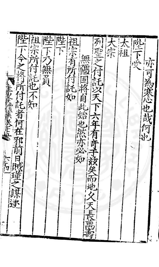 亦可為寒心也哉何也陛下受太祖太宗列聖之付託以天下六年有竒于兹矣而地乆天長萬壽無疆固將自此始也然亦必如祖宗有所付託如陛下陛下乃無負祖宗所付託也不知陛下今之將所付託者何在邪前日賊瑾之謀逐
