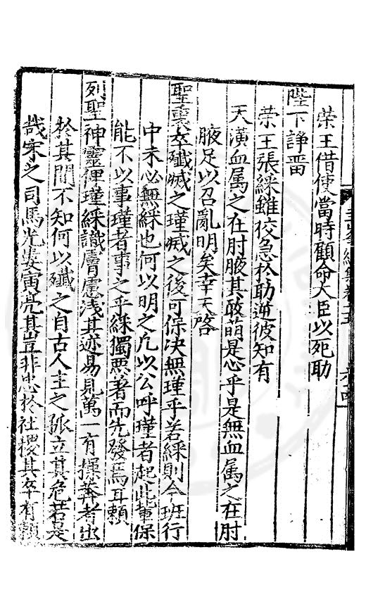 荣王借使當時顧命大臣以死助陛下諍留荣王張綵雖狡急扵助逆彼知有天潢血属之在肘腋其敢萌是心乎是無血属之在肘腋足以召亂明矣幸天啓聖衷卒殱滅之瑾滅之後可保决無瑾乎若綵則今班行中未必無綵也何以明之凢以公呼瑾者起此軰保能不以事瑾者事之乎綵獨悪着而先發焉耳頼列聖神靈俾瑾綵識膚慮淺其迹易見萬一有操莾者出扵其間不知何以殱之自古人主之孤立其危若是哉宋之司馬光婁寅亮其豈非忠扵社稷其卒有頼