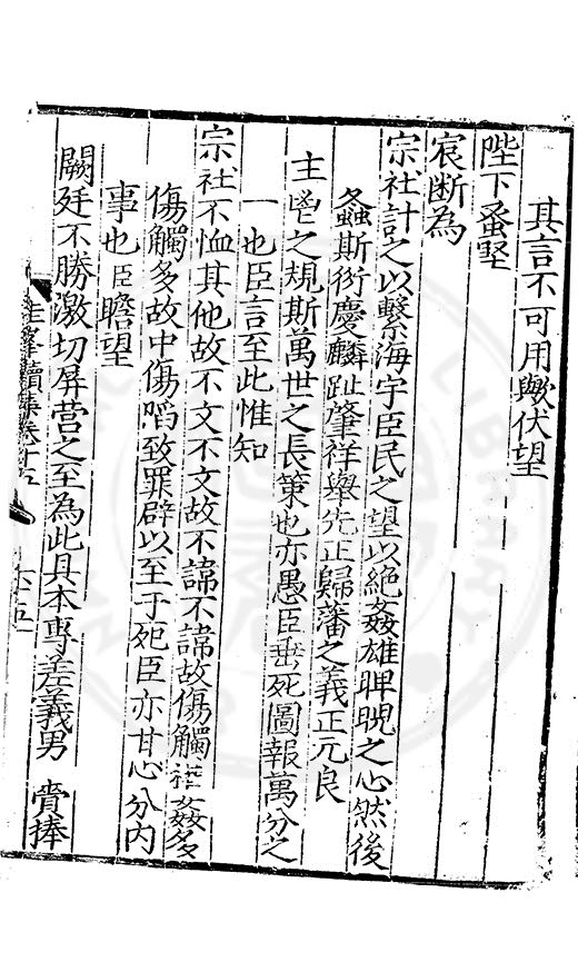 其言不可用歟伏望陛下蚤堅宸断為宗社計之以繫海宇臣民之望以絶姦雄睥睨之心然後螽斯衍慶麟趾肇祥舉先王歸藩之義正元良主鬯之規斯萬世之長策也亦愚臣垂死圖報萬分之一也臣言至此惟知宗社不恤其他故不文不文故不諱不諱故傷觸權姦多傷觸多故中傷啗致罪辟以至于死臣亦甘心分内事也臣瞻望闕廷不勝激切屏营之至為此具本專差義男 賫捧