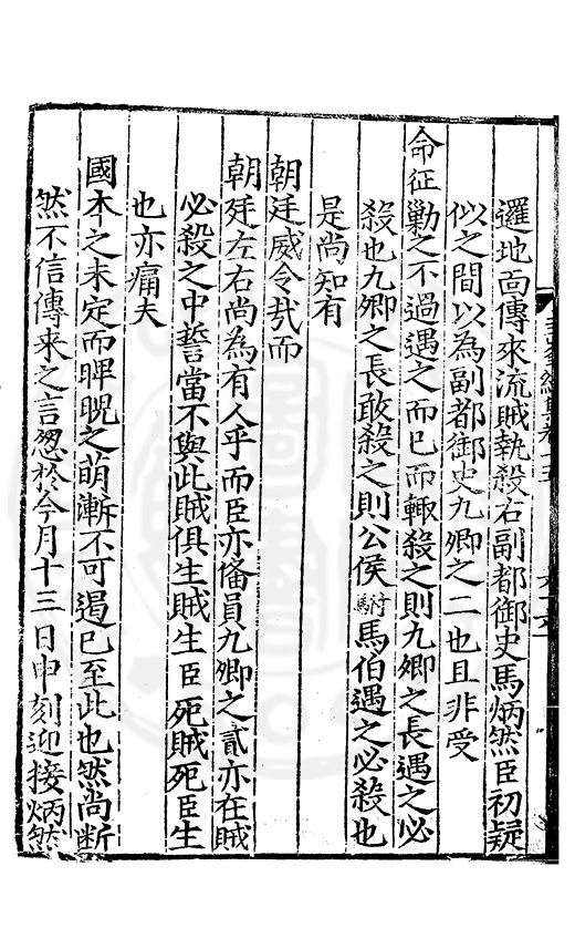 邏地靣傳來流賊執殺右副都御史馬炳然臣初疑似之間以為副都御史九卿之二也且非受命征勦之不過遇之而巳而輙殺之則九卿之長遇之必殺也九卿之長敢殺之則公侯駙馬伯遇之必殺也是尚知有朝廷威令哉而朝廷左右尚為有人乎而臣亦俻員九卿之貳亦在賊必殺之中誓當不與此賊俱生賊生臣死賊死臣生也亦痛夫國本之未定而睥睨之萌漸不可遏巳至此也然尚断然不信傳來之言忽扵今月十三日申刻迎接炳然