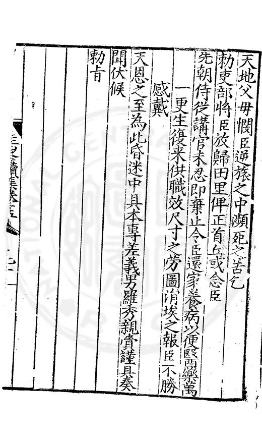 天地父毋憫臣逆旅之中瀕死之苦乞勅吏部將臣放歸田里俾正首丘或念臣先朝侍從講官未忍即棄止令臣還家養病以便醫藥萬一更生復來供職效尺寸之勞圖涓埃之報臣不勝感戴天恩之至為此昏迷中具本專差義男羅秀親齎謹具奏聞伏候勅旨