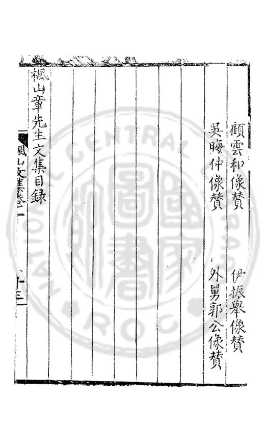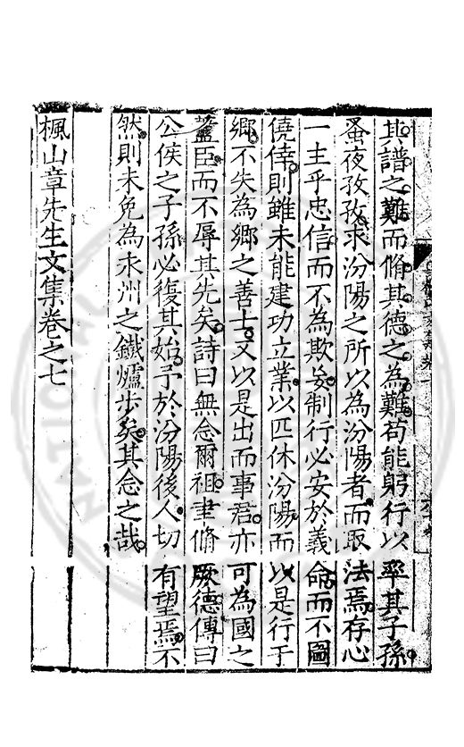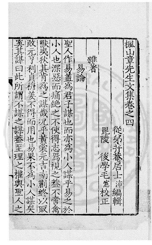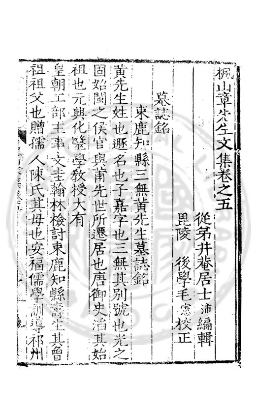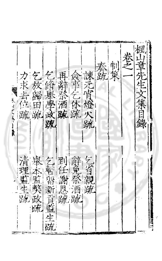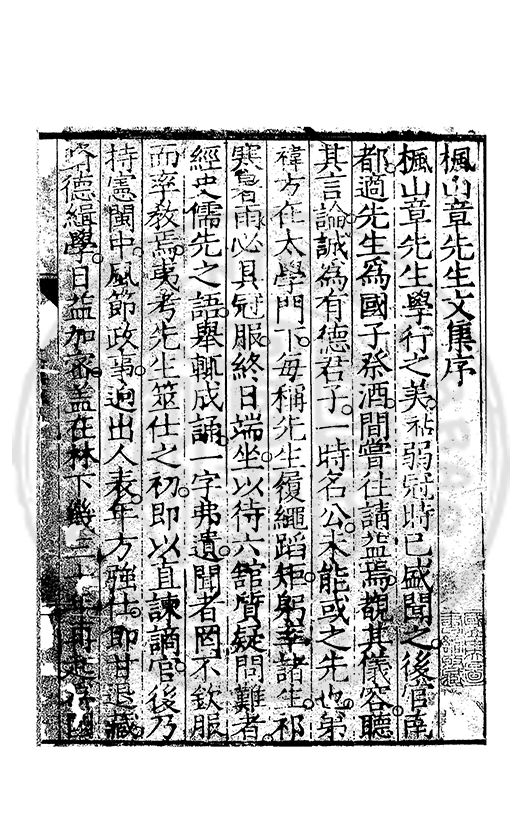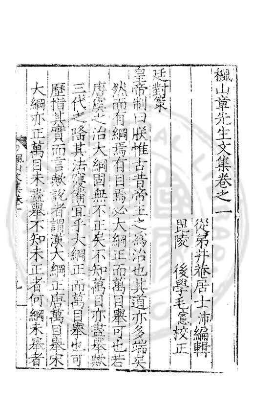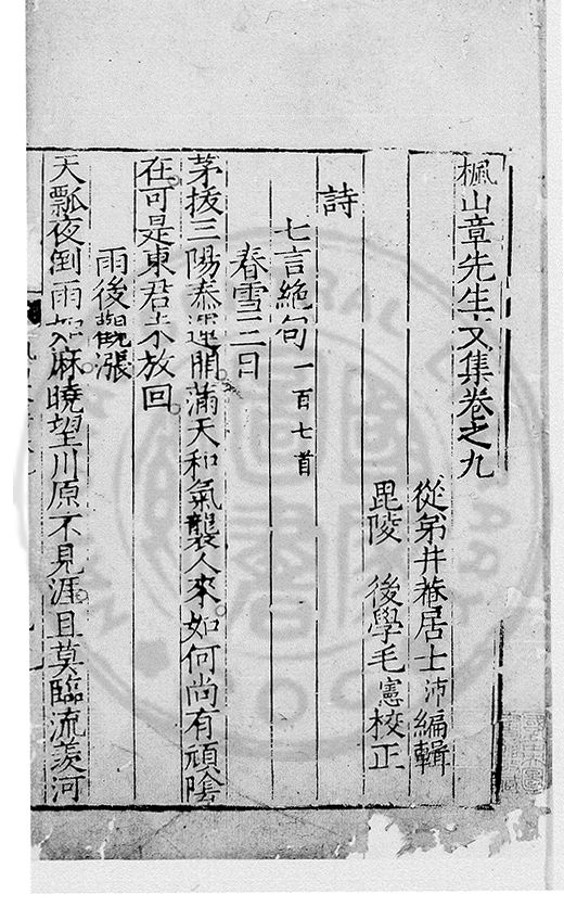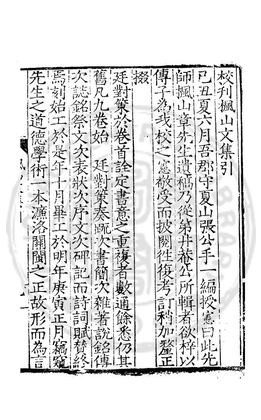 己丑夏六月吾郡守夏山張公手一編授憲曰此先師楓山章先生遺稿乃從弟井菴公所輯者欲梓以傳子為我校之憲敬受而披閱徃復考訂稍加釐正掇廷對策於卷首詮定書意之重複者數通餘悉仍其舊凡九卷始 廷對策奏疏次書簡次雜著說銘傳次誌銘祭文次表狀次序文次碑記而詩詞賦賛終焉刻始工於是年十月畢工於明年庚寅正月竊窺先生之道德學術一本濂洛關閩之正故形而為言