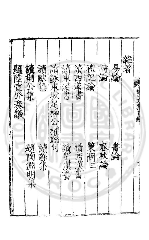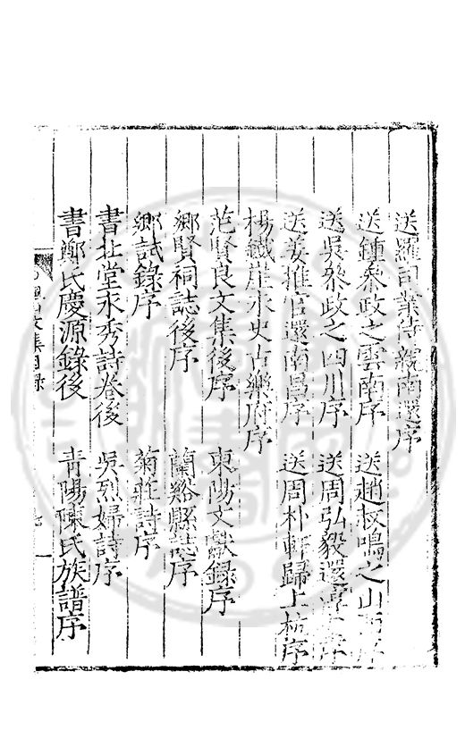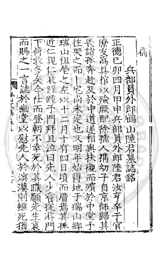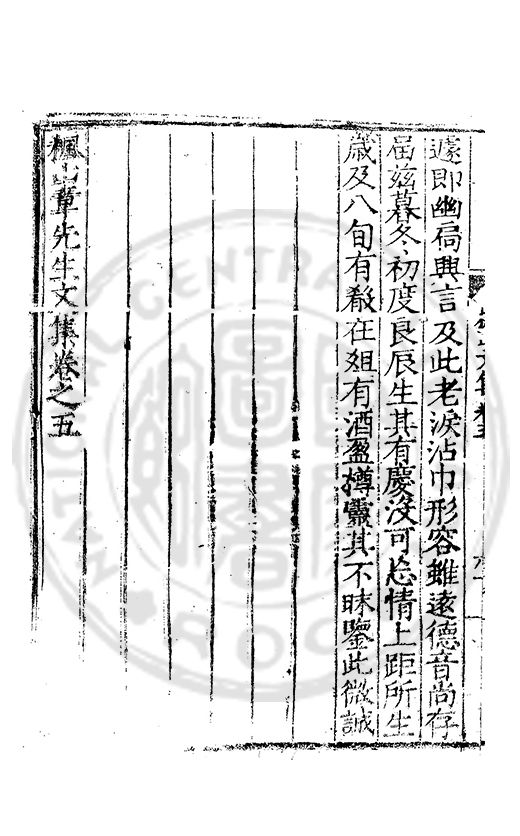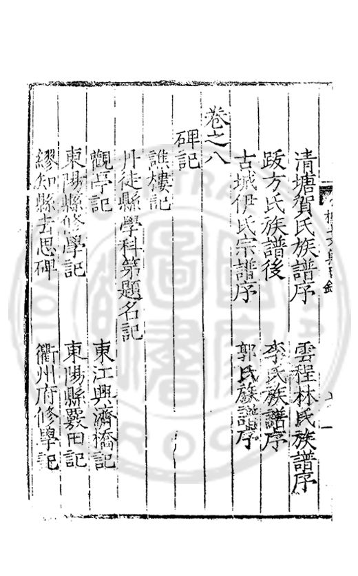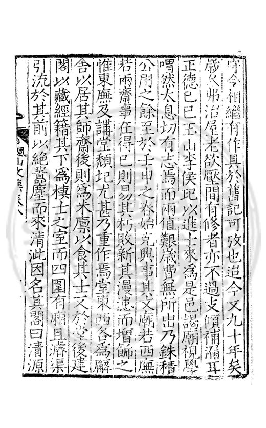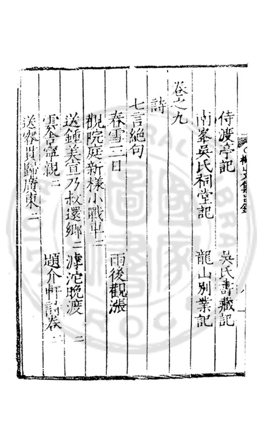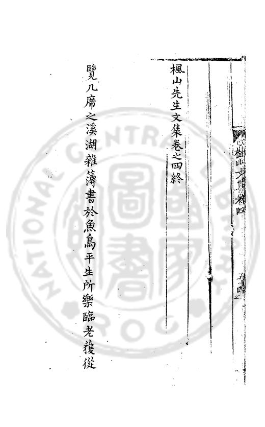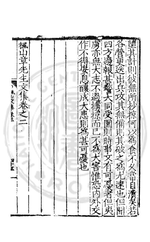 己丑夏六月吾郡守夏山張公手一編授憲曰此先師楓山章先生遺稿乃從弟井菴公所輯者欲梓以傳子為我校之憲敬受而披閱徃復考訂稍加釐正掇廷對策於卷首詮定書意之重複者數通餘悉仍其舊凡九卷始 廷對策奏疏次書簡次雜著說銘傳次誌銘祭文次表狀次序文次碑記而詩詞賦賛終焉刻始工於是年十月畢工於明年庚寅正月竊窺先生之道德學術一本濂洛關閩之正故形而為言