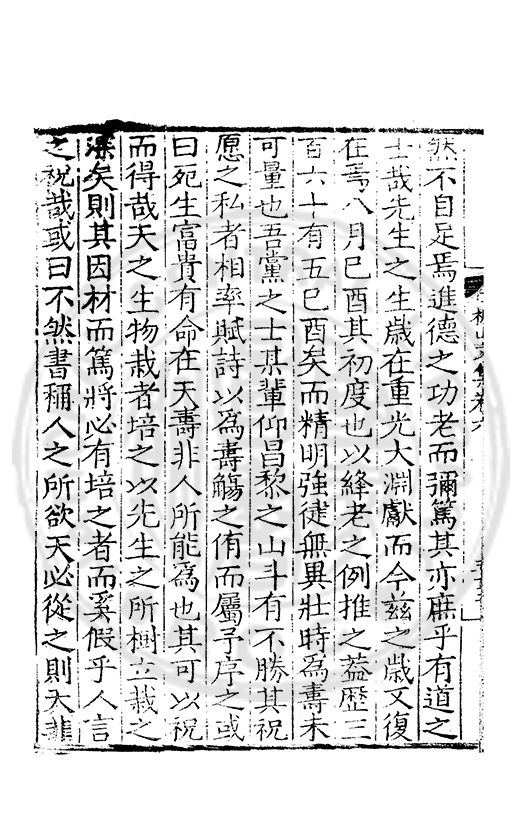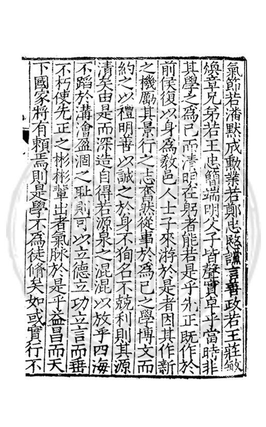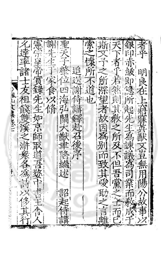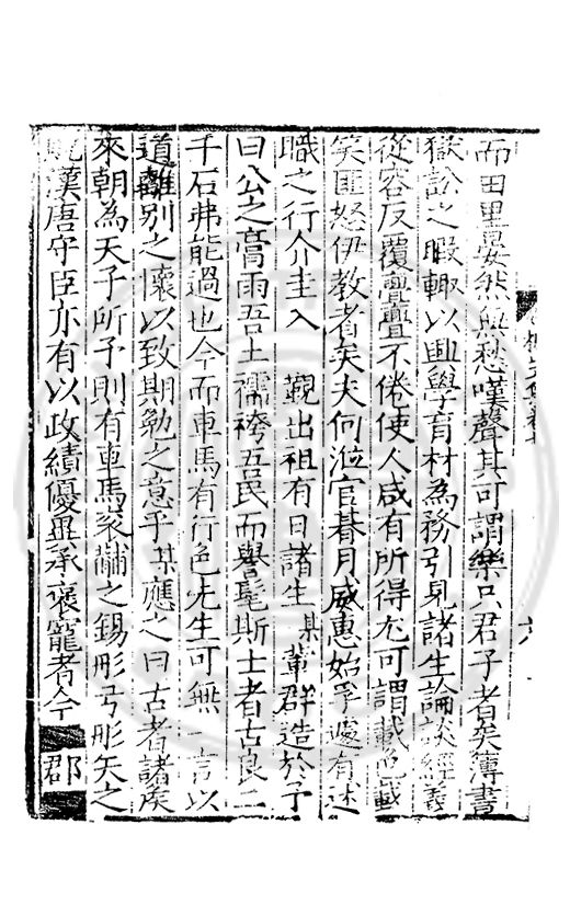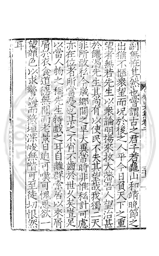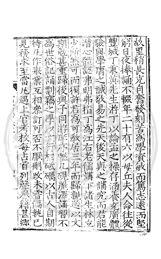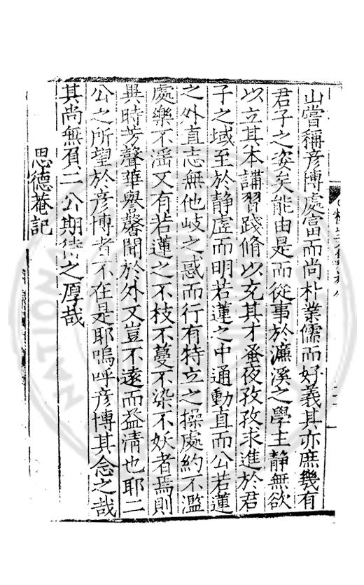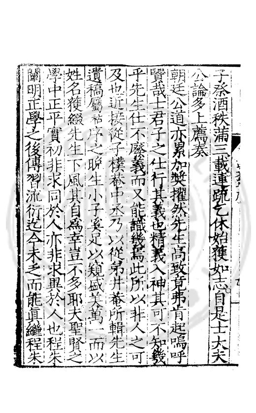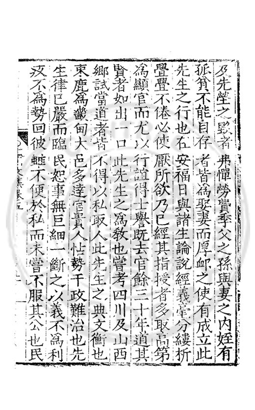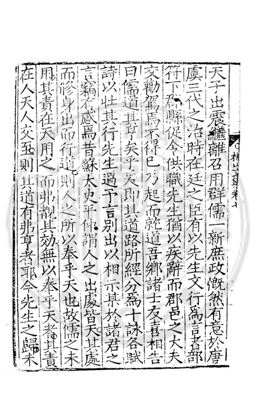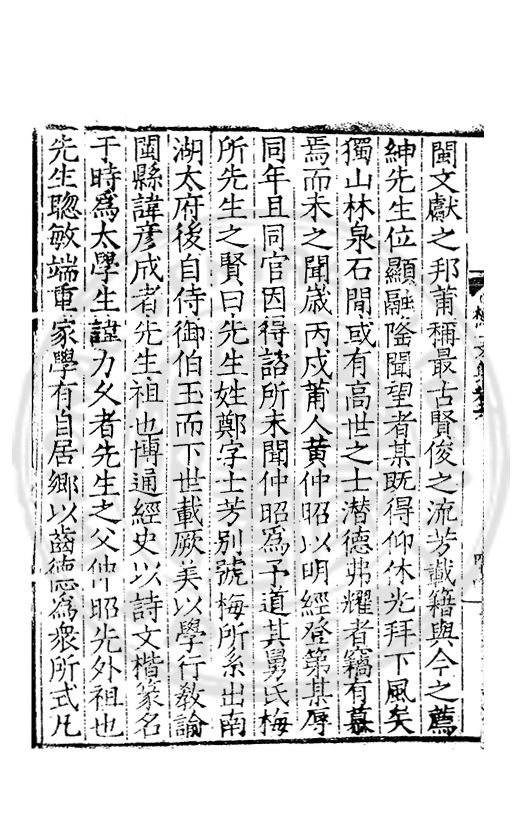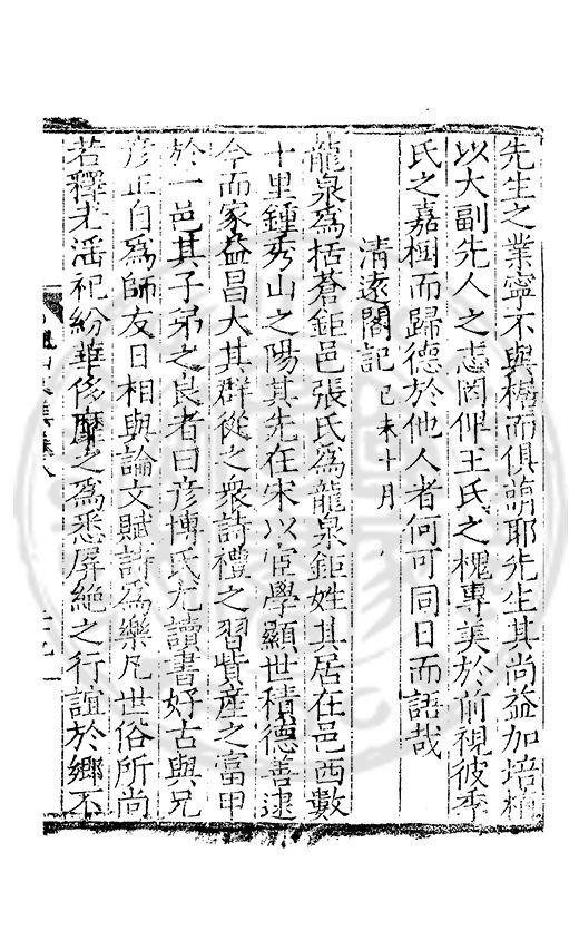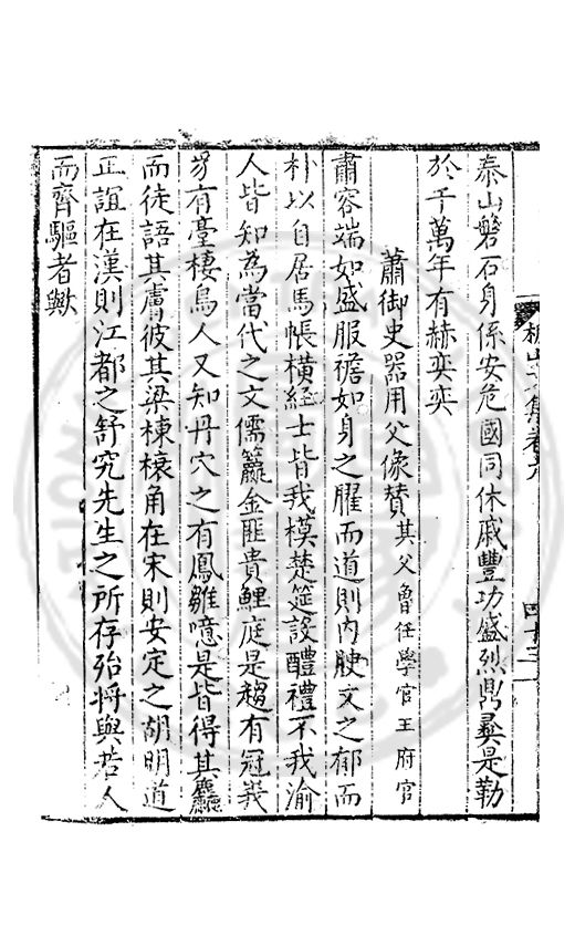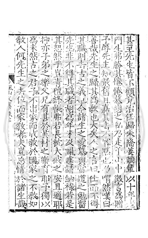 肅容端如盛服襜如身之□而道則内腴文之郁而朴以自居馬帳横経士皆我模楚筵設醴禮不我渝人皆知為當代之文儒籝金匪貴鯉庭是趨有冠峩豸有臺棲烏人又知丹穴之有鳯雛噫是皆得其麤而徒語其膚彼其梁棟榱角在宋則安定之胡明道正誼在漢則江都之舒究先生之所存殆将與若人而齊驅者歟
