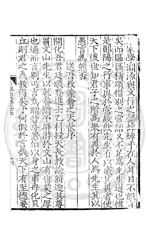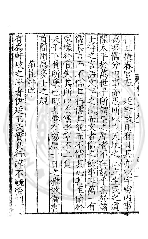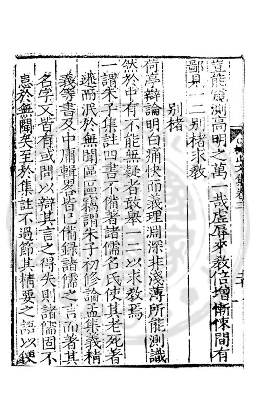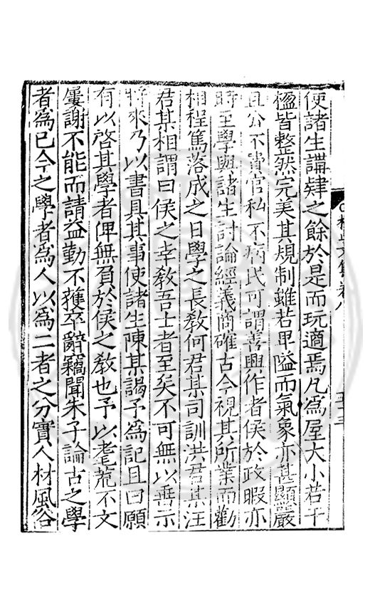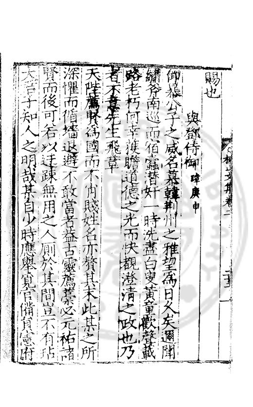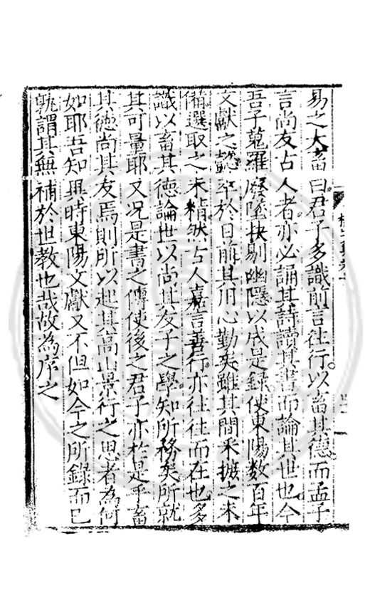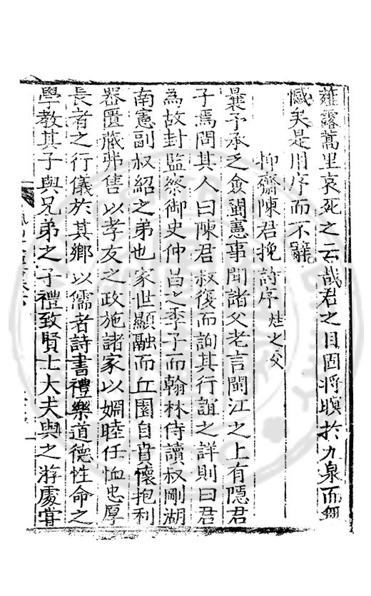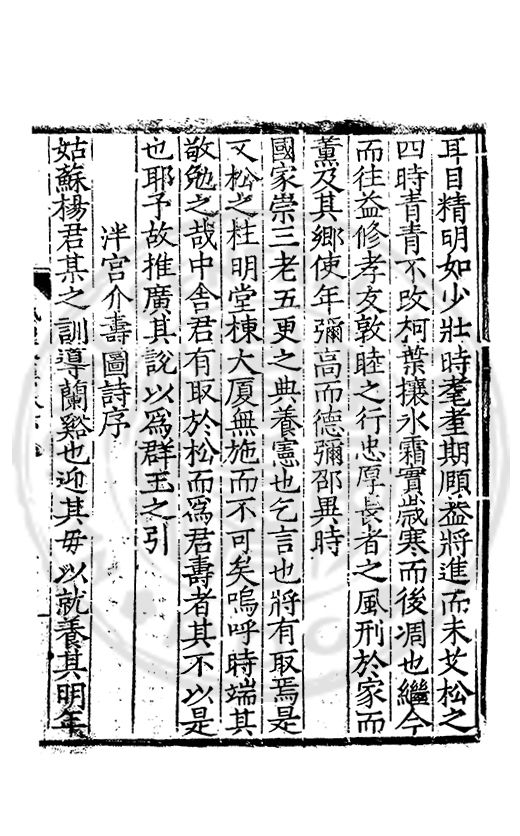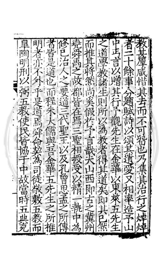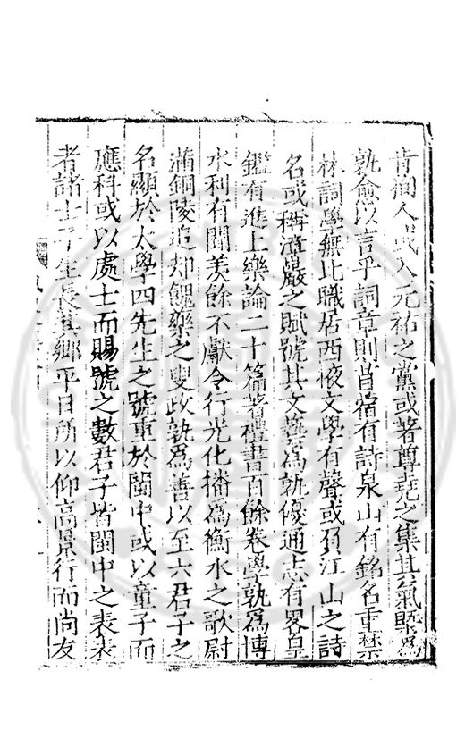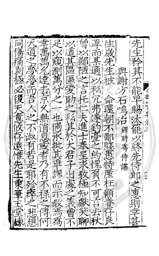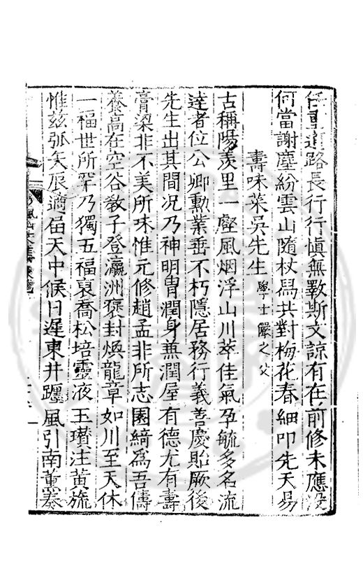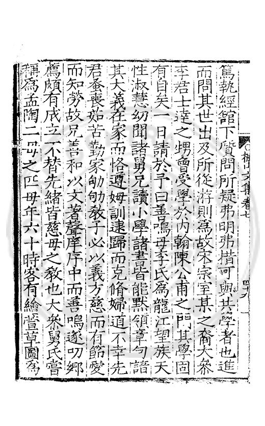 肅容端如盛服襜如身之□而道則内腴文之郁而朴以自居馬帳横経士皆我模楚筵設醴禮不我渝人皆知為當代之文儒籝金匪貴鯉庭是趨有冠峩豸有臺棲烏人又知丹穴之有鳯雛噫是皆得其麤而徒語其膚彼其梁棟榱角在宋則安定之胡明道正誼在漢則江都之舒究先生之所存殆将與若人而齊驅者歟