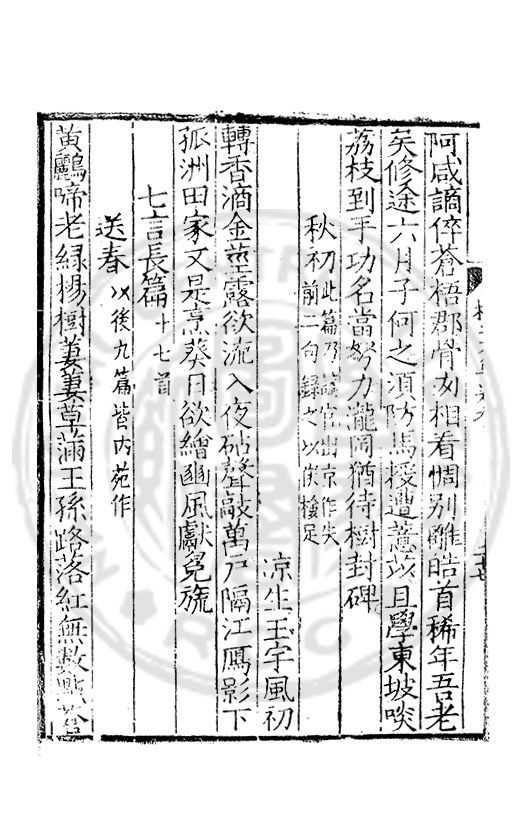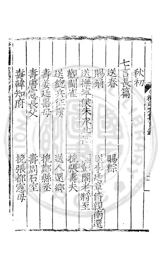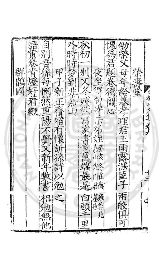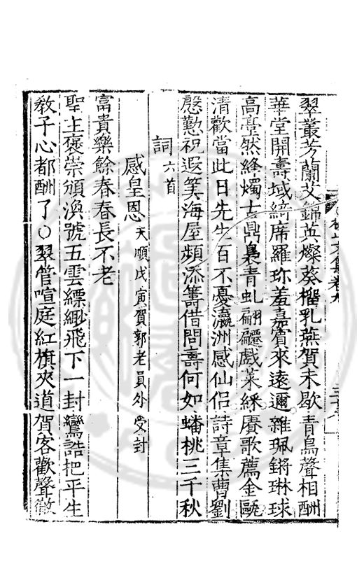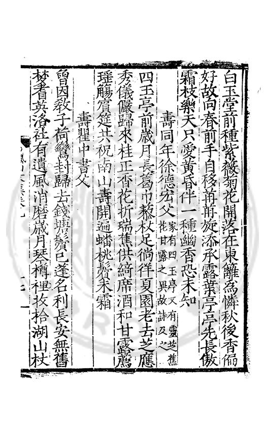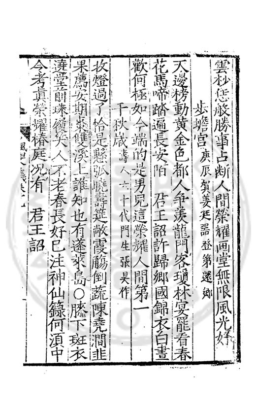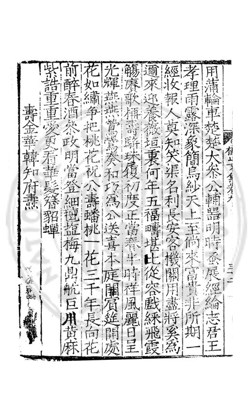 翠叢芳蘭艾錦英燦葵榴乳燕賀未歇青鳥聲相酬華堂開夀域綺席羅珎羞嘉賔來逺邇雜珮鏘琳球高臺然綘燭古鼎裊青虬翩□戲萊綵賡歌薦金甌清歡當此日先生百不憂瀛洲感仙侣詩章集曹劉慇懃祝遐筭海屋頻添籌借問壽何如蟠桃三千秋