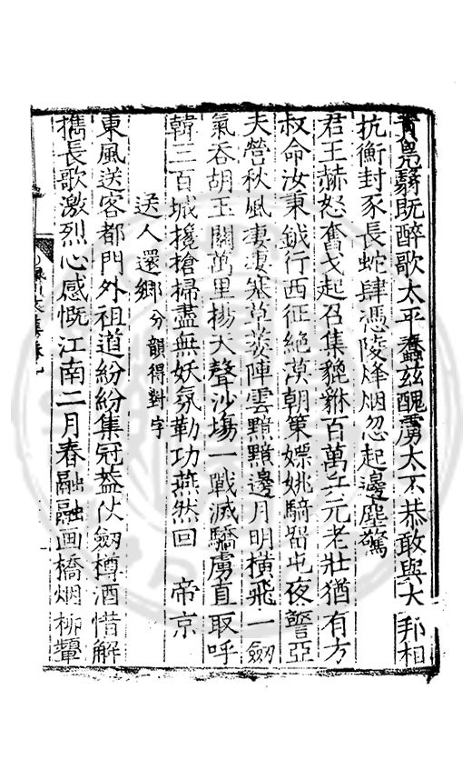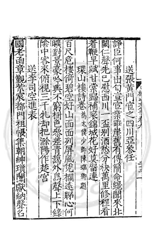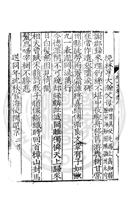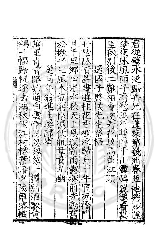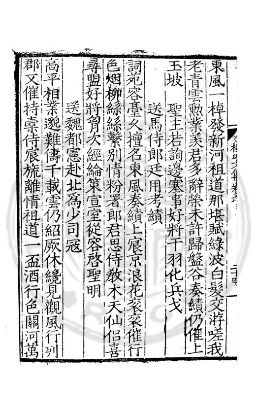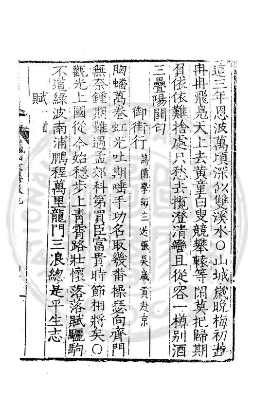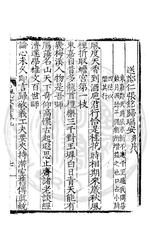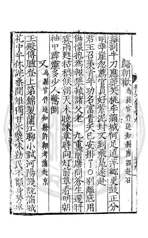 雞割牛刀應莞笑桃李滿城何足道萍鄉更鼓正分明乖崖忽薦官員好紫泥封又到飛鳬逺赴君王召羡青年功名富貴天巳安排了○别離底用傷懷抱爲報攀轅諸父老 九重前席問蒼生還將霖雨甦枯稿候朝天未曉諫章時向灯前草看明朝袖中霹靂多少人驚倒