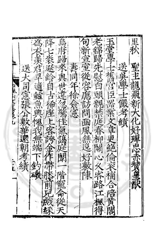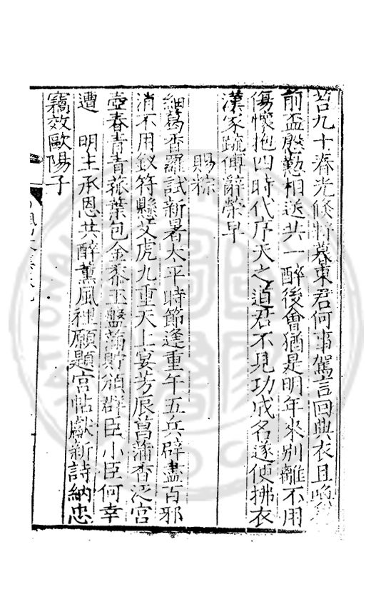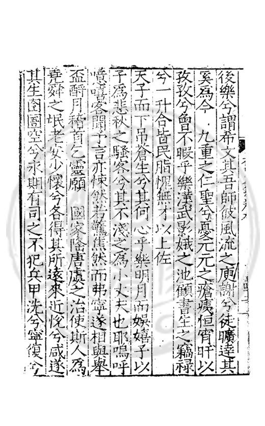 苖之徂征家家見月兮有忻然之色人人對景兮無嘆息之聲豈若唐人聮句而專長日之樂殆猶虞氏皷琴而公解愠之情則吾與子非特誇今夕一時之樂事且将祝皇明萬世之太平