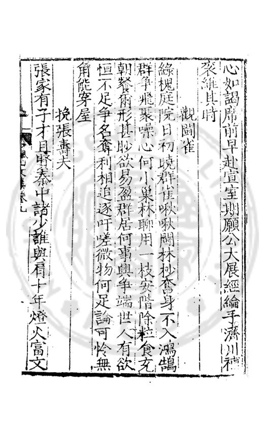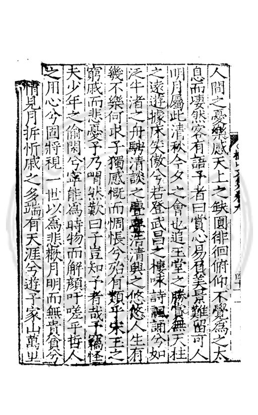 人間之憂樂感天上之缺圓徘徊俯仰不覺爲之太息而凄然客有語予者曰賞心易負美景難留可人明月屬此清秋今夕之會也追玉堂之勝賞無天柱之逺逰據床笑傲兮若登武昌之樓咏詩諷誦兮如泛牛渚之舟騁清談之亹亹浩清興之悠悠人生有幾不樂何求子獨感慨而惆悵兮殆有類乎宋玉之窮戚而悲憂予乃喟然歎曰子豈知予者哉予竊怪夫少年之偷閑兮寜能爲時物而解顔吁嗟乎哲人之用心兮固將視一世以爲悲歡月明而無貴貧兮□情見月拆忻戚之多端有天涯兮逰子家山萬里