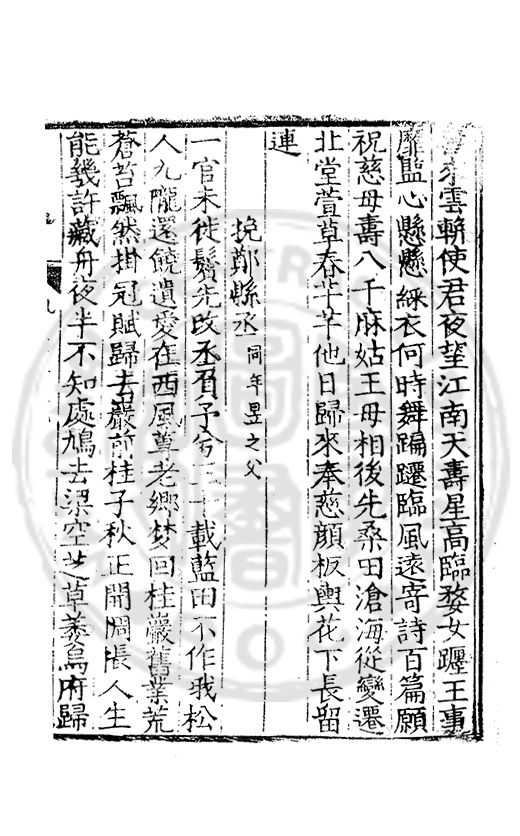 收燈過了恰是懸弧曉夀筵敞霞觴倒蔬陳堯澗韭果薦安期棗雙溪上誰知也有蓬萊島○膝下斑衣遶堂前珠履笑人不老春長好巳注神仙籙何湏中令考眞榮耀椿庭况有 君王詔