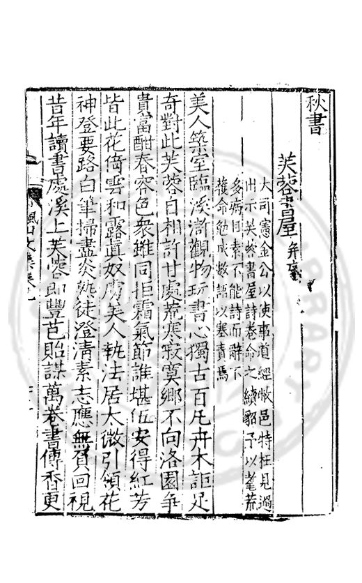 素昊司時蓐收行政日道西陸斗回酉柄大火下於坤維虗宿中乎離正掃赤煒之煩酷布金行之清静豆雨飽兮初歇梧風颯兮漸勁凉露零而金莖香灝氣浮而玉宇净燕翩翩以東歸兮鴈嘹嘹而南競蟬咽聲以不鳴兮鷹奮迅而欲横南吕之律始中西兌之治方盛繄三五之良宵適平分之秋令暮烟霽而雲容四歛□水澄而天光遥映斯時也隂精陽彩坎象懸空西魄巳載東魄未終望舒御兮駕氷輪於海東素娥舞兮調霓裳於曲中穆穆兮金波有影團團
