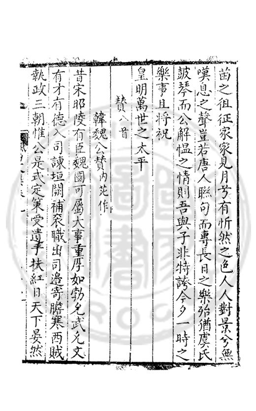 昔宋昭陵有臣魏國可屬大事重厚如勃允武允文有才有徳入司諫垣闕補衮職出司邉寄膽寒西賊執政三朝惟公是式定策受遺手扶紅日天下晏然