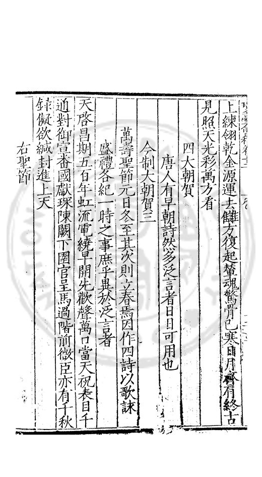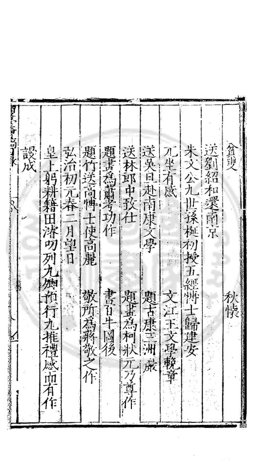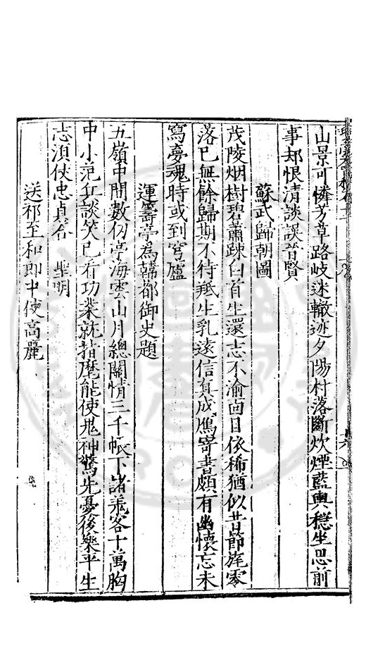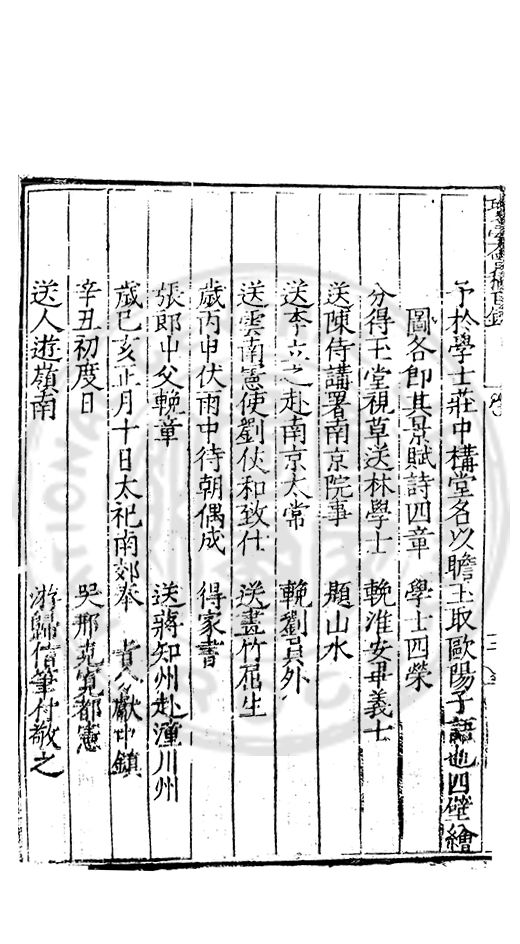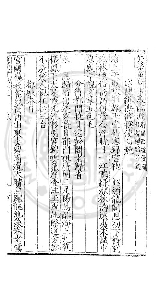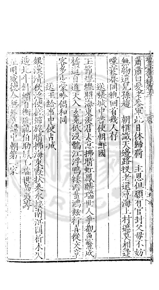 聖主登基禮百神 宗藩告祀遣親臣寶香含霧來天止玉節朋霞照漠濱禁□舊傳金孔雀宮袍新製繡麒麟臨分贈策丁寧語車盖亭前問故人