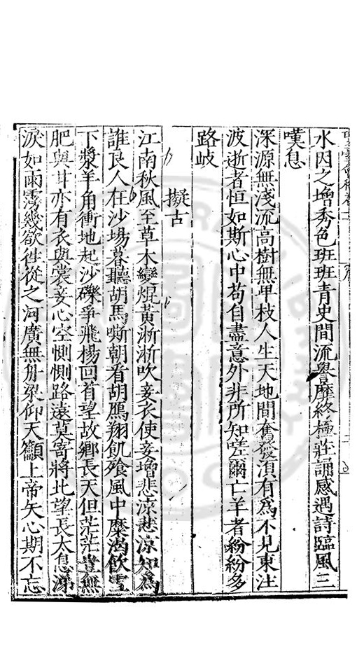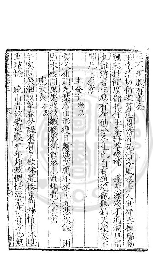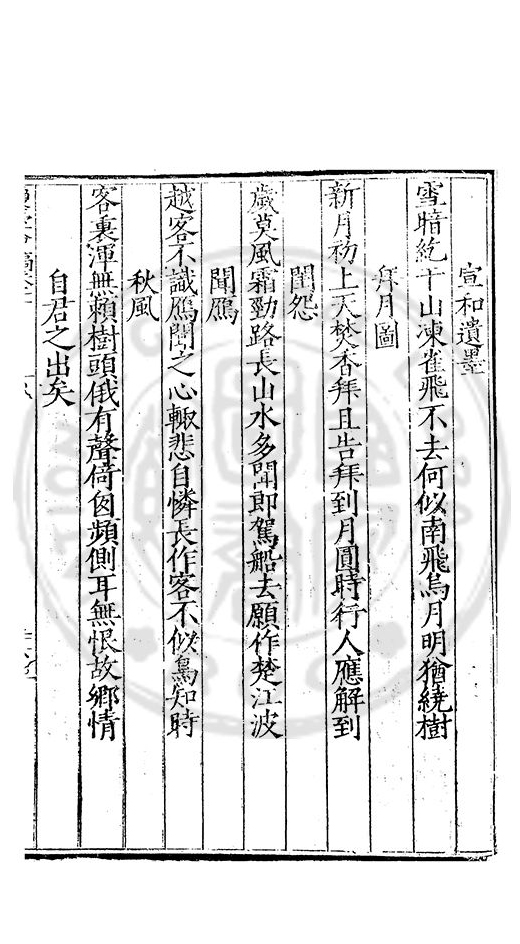 雲散嶺頭光葉落山形瘦目斷遙空鴈不來正是悲秋候□雨點水痕圓風蹙波紋皺顧影徘徊落小池頓覺人非舊