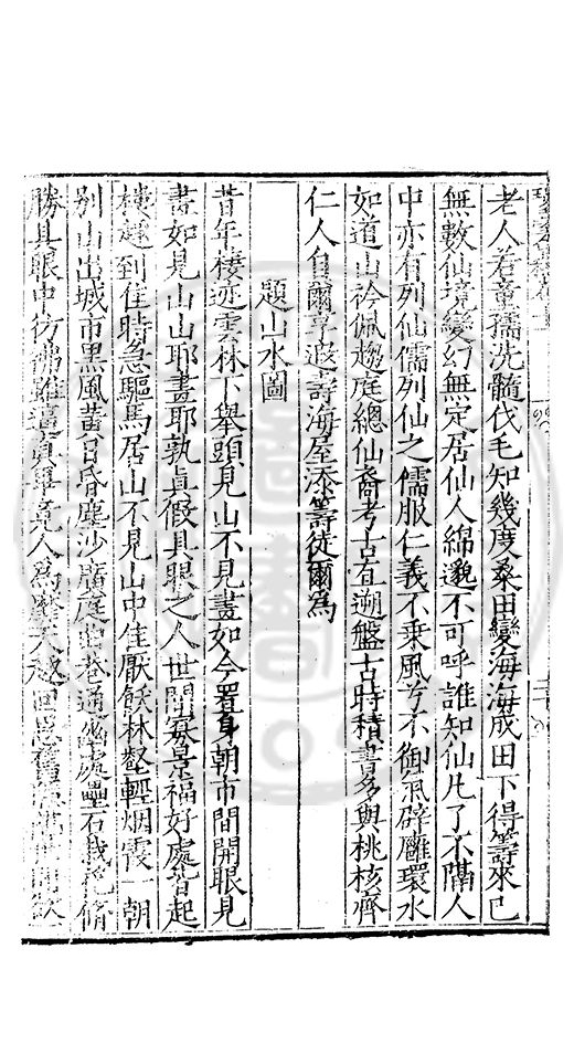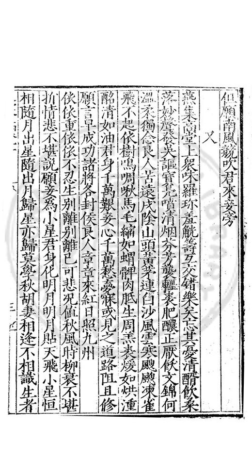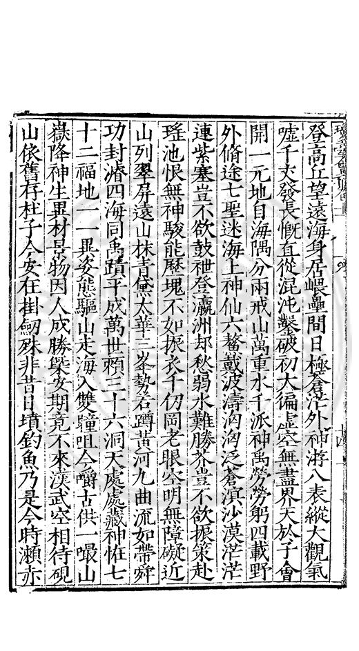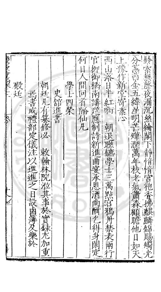 玉堂清切倚璇霄延閣欝岧嶤清冷風露非人世祥雲擁瑞藹飄飄村館廣儲杞梓玉峯群萃瓊瑤 蓬萊深淺不通潮無福也難消書生應有神仙分今生也自在逍遙飽聽鈞天樂奏不聞凡世塵囂