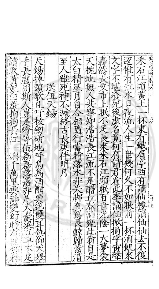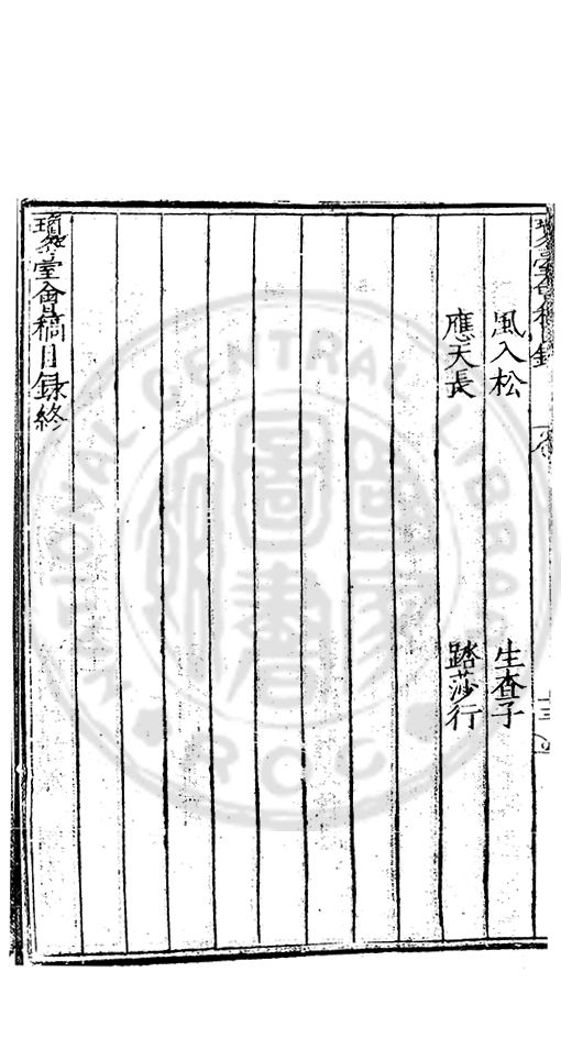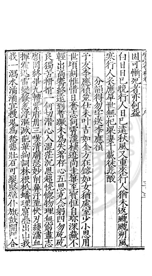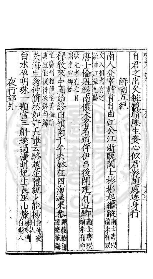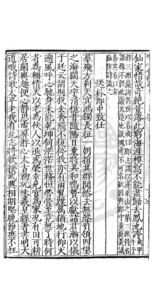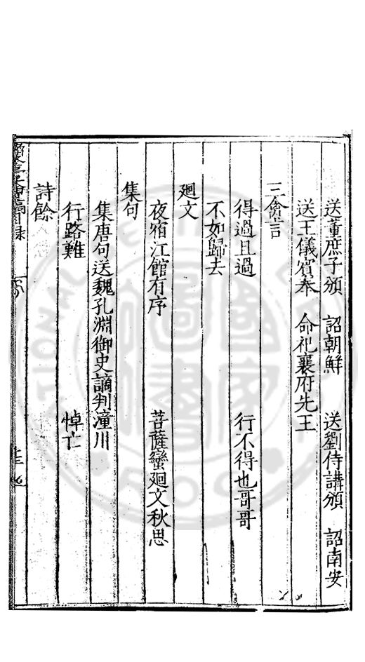 鳴玉朝來散紫宸鳳樓回首落花頻鵷鴻得路争先翥鸚鵡才高却累身直以疏慵招物議不趨權勢正因循只因宋王閑唇吻自保曾參不殺人謾說簡書惟物役猶將談笑出風塵眼前好惡那能定夣裡輸嬴總不真芳草有情皆礙馬江湖何處不通津長空淡淡飛鳥滅客舍青青栁色新東澗水流西澗水錦江春似曲江春長沙不乆留才子莫厭傷多酒入唇