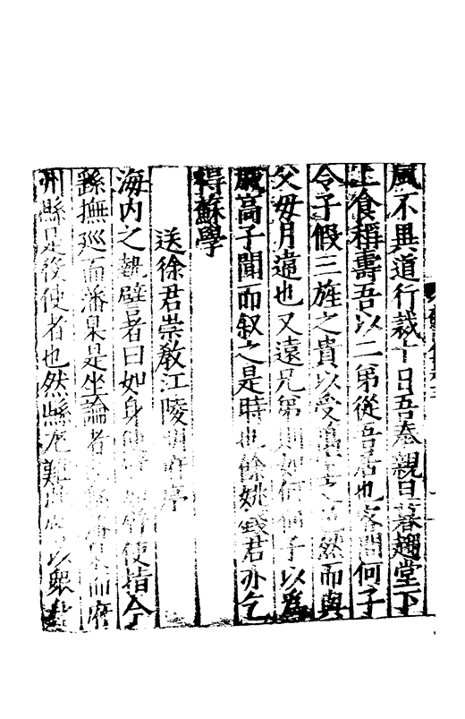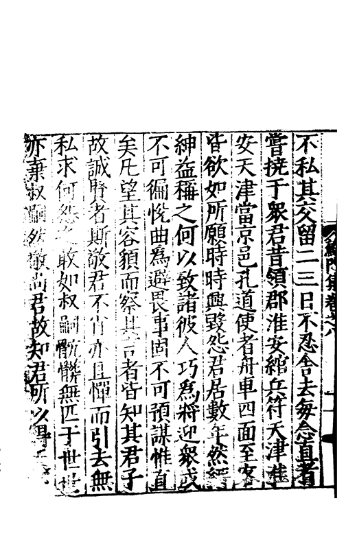 不私其交留二三日不忍舎去每念直者甞撓于衆君昔領郡淮安綰兵符天津淮安天津當京邑孔道使者舟車四面至客皆欲如所願時時興毀怨君居數年然縉紳益稱之何以致諸彼人巧為將迎衆或不可徧恱曲為避畏事固不可預謀惟直矣凡望其容貌而察其言者皆知其君子故誠賢者斯敬君不肖亦且憚而引去無私求何怨之敢如叔嗣骯髒無匹于世世亦棄叔嗣然敬尚君故知君所以得天下