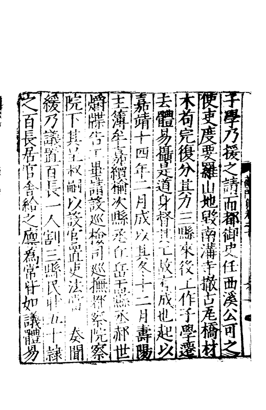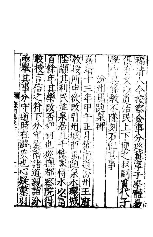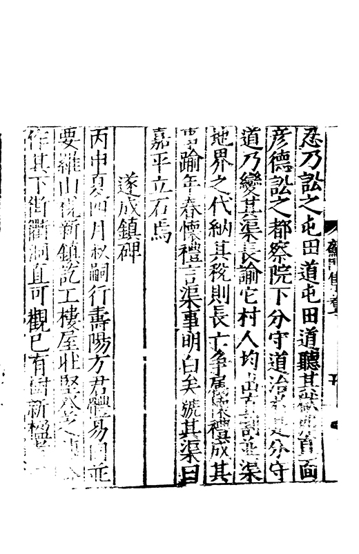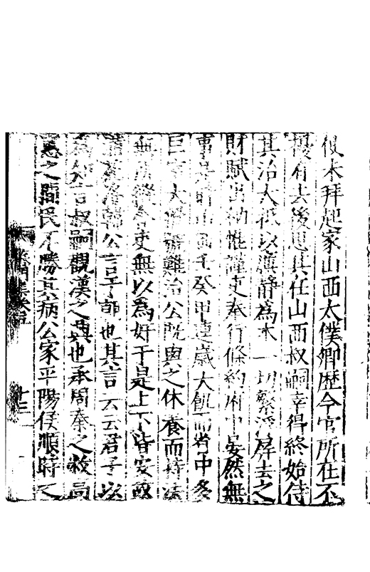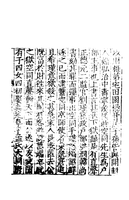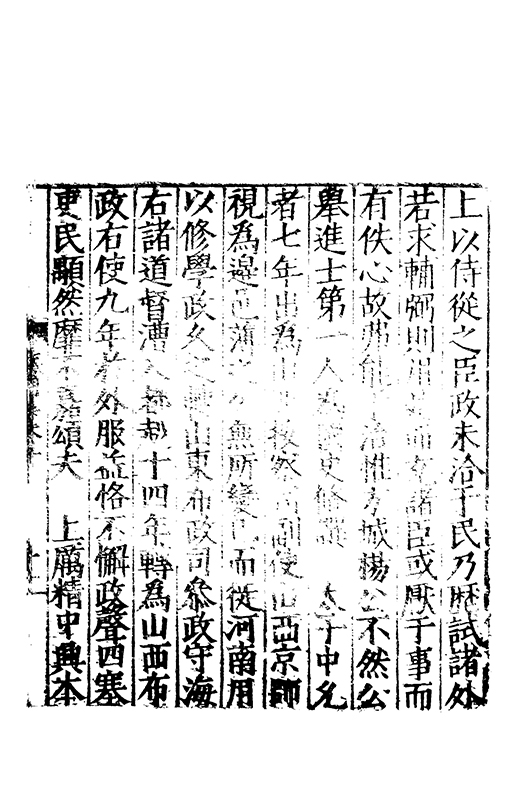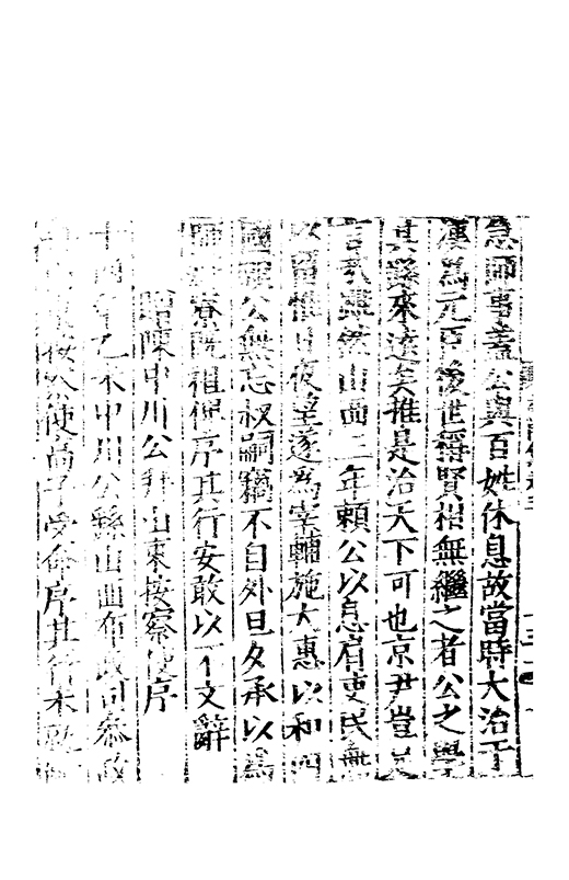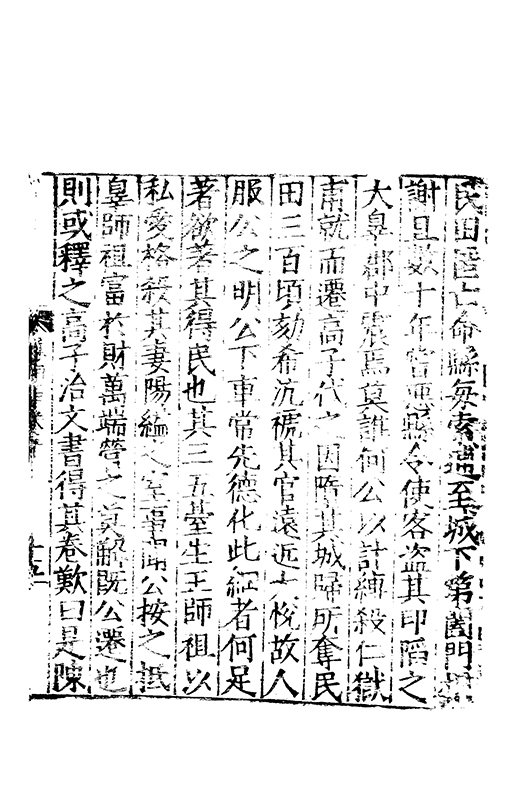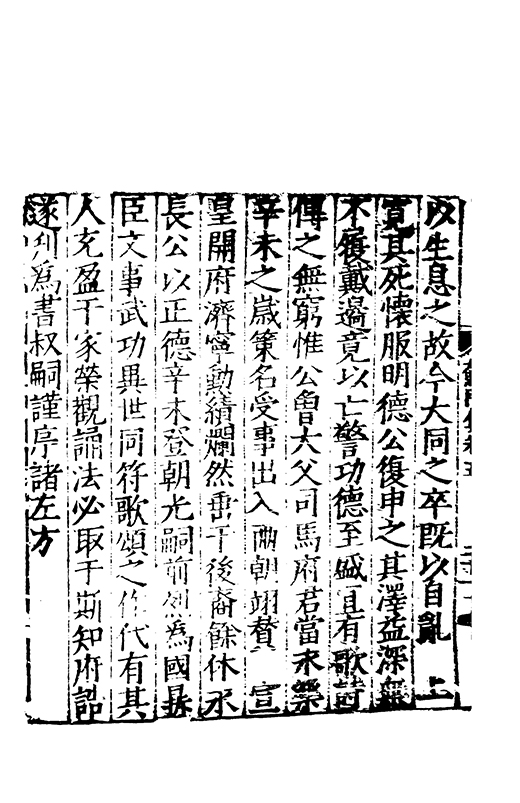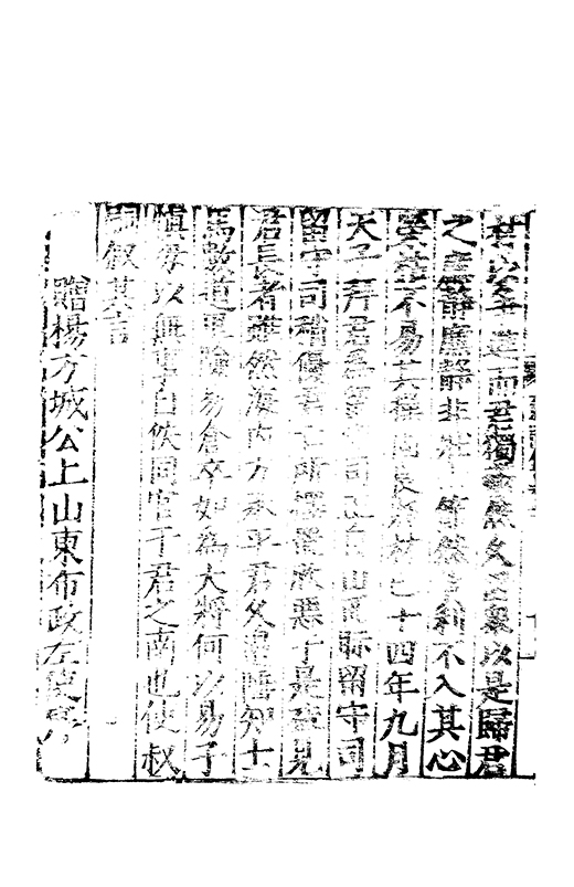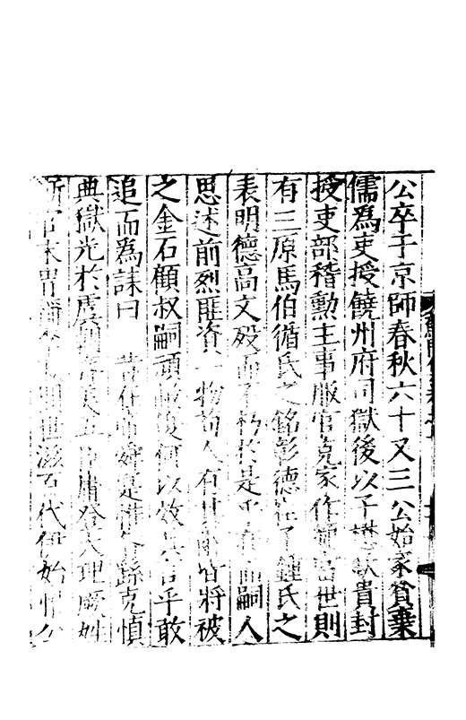在昔先民惟名與位茍取其一莫兼其二自非大雅孰能兩至淵哉府君曠世高視先朝弘治時維休明俊乂四集偕應弓旌試宰洪洞民嬉政成郡國交舉天子是徴歴佐司徒撫翼皇庭處煩不厭在衆能澄乃守平凉既踐扵夔寵命亨嘉紫綬金龜川流雨潤恵政旁施四民弗擾一郡咸宜邦降褒禮人興頌詩君子有行與時舒卷未老引年稱疾自免中林放達故里偃蹇