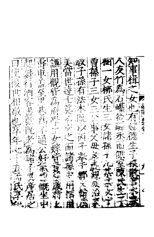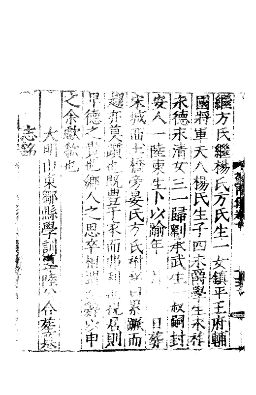 繼方氏繼楊氏方氏生一女鎮平王府輔國將軍夫人楊氏生子四永爵學生永祚永德永清女三一歸劉承武生一叔嗣封安人一陸柬生卜以踰年 月 日葬宋城西土橋旁晏氏方氏祔銘曰累蹶而趨亦莫躓也既豐于家而弗利也視居則卑德之貴也鄉人之思卒相謂也辭以申之余歔欷也