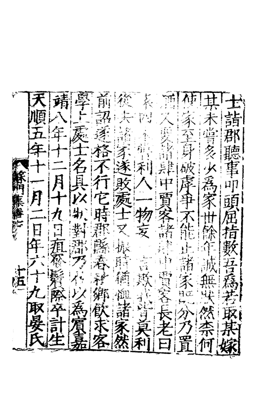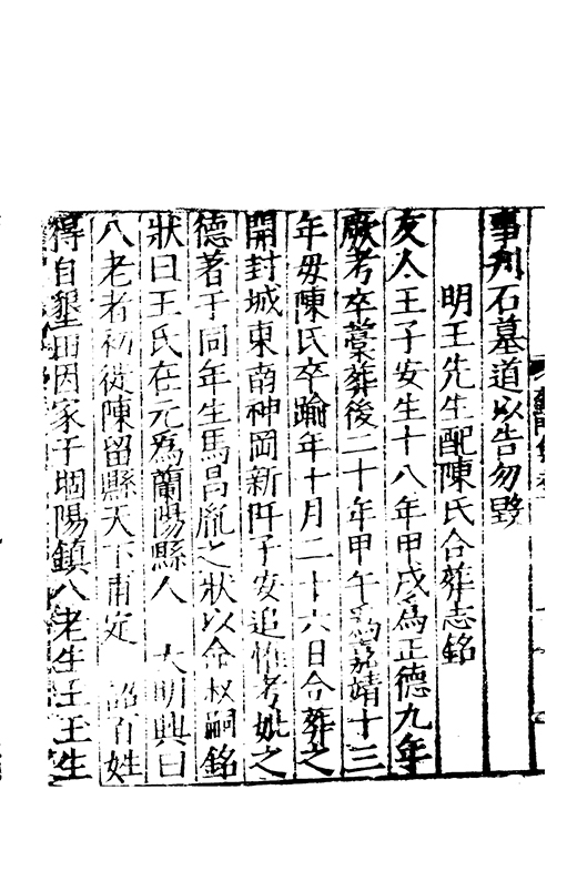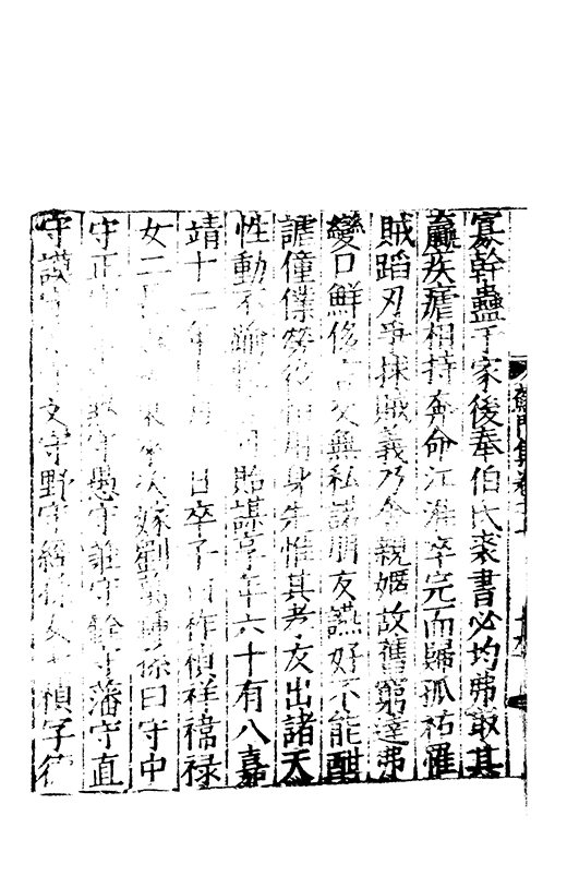 寡幹蠱于家後奉伯氏裘書必均弗取其贏疾瘧相持奔命江淮卒完而歸孤祐罹賊蹈刃爭捄賊義乃舍親嫟故舊窮達弗變口鮮侈言交無私諾朋友讌好不能酣謔僮僕勞役恒用身先惟其孝友出諸天性動不踰軌言可貽謀享年六十有八嘉靖十二年七月 日卒子曰祚禎祥禕禄女二長嫁張東萊次嫁劉萬鍾孫曰守中守正守道守黙守愚守莊守銓守藩守直守謨守讓守文守野守經孫女七禎字德