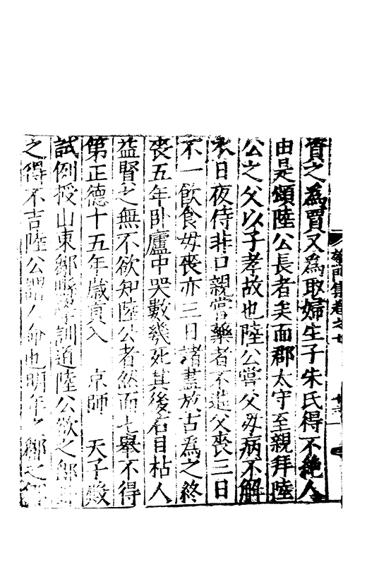 資之為賈又為取婦生子朱氏得不絶人由是頌陸公長者矣而郡太守至親拜陸公之父以子孝故也陸公甞父母病不解衣日夜侍非口親甞藥者不進父喪三日不一飲食母喪亦三日諸盡放古為之終喪五年卧廬中哭數幾死其後右目枯人益賢之無不欲知陸公者然而七舉不得第正德十五年歲貢入 京師 天子殿試例授山東鄒縣學訓導陸公欲之鄒卦之得不吉陸公謂人命也明年之鄒之鄉