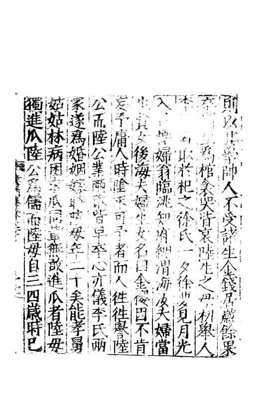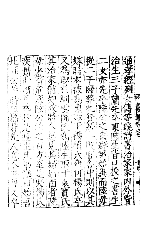 通孝經列女傳等曉詩書治家家内外皆治生三子蘭先卒東陸生皆口授之書生二女亦先卒陸公之喪群弟始異而陸母從二子歸葬也貧居一敗官舍中則以其嫁時衣被為東取于楊禎氏無何楊氏卒又為取扵劉雲圖氏為陸生取于袁寳氏其治家猶如故時人莫見其婦姑面者陸母少甞危疾陸公治之百方至是哭楊氏疾動卧兩月卒扵是陸生兄弟議曰始吾北涯公葬時無銘非先人意今吾母又卒
