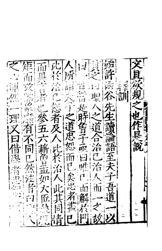 始許函谷先生讀論語至夫子吾道一以貫之曰聖人之道合治已治人而一之故曰一貫當是時曾子亟曰唯已而解扵門人所謂夫子之道忠恕而已矣忠者盡已比扵治已恕者及人比扵治人此其同情而異言者也參五六籍曾孟如大匠執規矩而攷器象靡有不同已然注者曰聖人之心渾然一理又曰借學者忠恕之事其