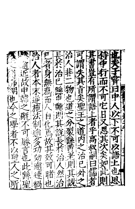 也夫子甞曰中人以下不可以語上也思得中行而不可它日又思其次矣如此則其書豈有所謂語上者乎高叔嗣曰儒者可謂失其旨矣聖王之道内之治已外之治人非二物也道之分裂由黄老則其說長扵治已繇申韓則其說長扵治人然治已者身無為而人自化焉故其效可睹也治人者本末逆施法制逾多功效逾速禍慘逾近故申韓之旤不可勝言也此繇聖人之道弗明也今之學者不以聖人之所
