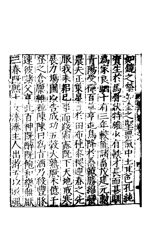如鏡之瑩如金之堅禀氣中土其色孔純資生扵馬骨狀特雄少有軼才長而甚馴為家良駟十有三年較能諸畜茂建元勲青陽受禪百草亨屯鳥降扵桑戴勝綿蠻農夫正策星言扵田布種黍稷迎春之先服我耒耜已事而踆霜露既下天地戒寒展力塲圃以告成功五榖大熟厥禾億千登之倉廩維粒陳陳曰為旨酒乃殺豐豚速彼諸父享此百神既醉既飽和樂無厭三春既熈士女溱溱主人出游于以遨魂