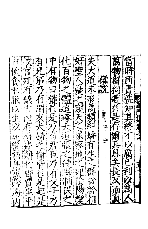 夫大道未形萬類糾蟠有生之群紛紛相奸聖人憂之窺天之象察地之理隂陽變化百物之體追琢大道張之使縣制民之中有物曰權扵是乃有君臣乃有父子乃有兄弟乃有朋友夫婦之倫皆扵是起是故宫廷有儀吉凶有禮農耕扵野賈坐乎市飲食衣服以生以死蠻貊鳥獸跨海内