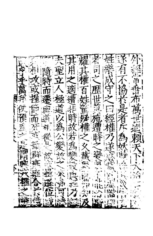 外經常垂布萬世逌賴天下大治亡物不遂有不協扵是者斥為妖孽逢其災害百姓樂成守之曰經權乃遂廢藏為虛器聖者司之歴世莫施遭時之變衆不能治時耀其權百姓驚疑權之乆藏衆既弗知及其用之適遭非時故若為變設與經乃離夫聖立人極道以為公變故之來弗可勝窮隨時而遷與道相從是故或揖遜位或兵相攻或握節而死或攝群雍雍合扵億載孚乎萬邦使預為之是謂興戎權之推