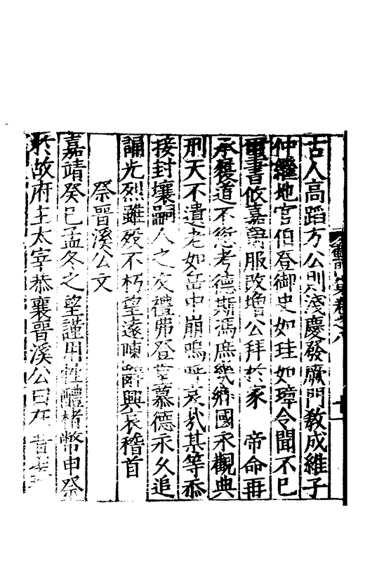 古人高蹈方公則淺慶發厥門教成維子仲繼地官伯登御史如珪如璋令聞不已璽書攸嘉爵服改增公拜扵家 帝命再承履道不愆考德斯馮庶幾鄉國永觀典刑天不遺老如岳中崩嗚呼哀哉某等忝接封壤嗣人之友禮弗登堂慕德永乆追誦光烈雖歿不朽望逺陳辭興哀稽首