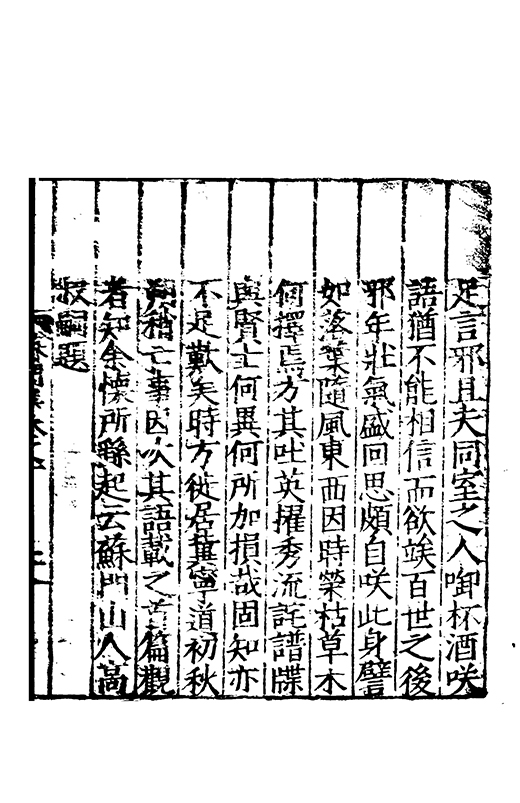 足言邪且夫同室之人啣杯酒咲語猶不能相信而欲竢百世之後邪年壯氣盛囬思頗自笑此身譬如落葉隨風東西因時榮枯草木何擇焉方其吐英擢秀流詫譜牒與賢士何異何所加損哉固知亦不足嘆矣時方徙居冀寧道初秋朔稍亡事因次其語載之首篇觀者知余懐所繇起云蘇門山人高叔嗣題