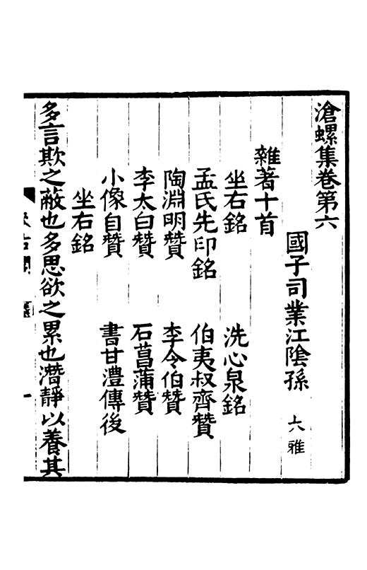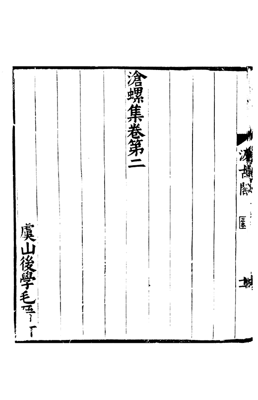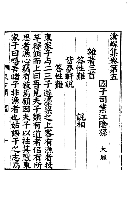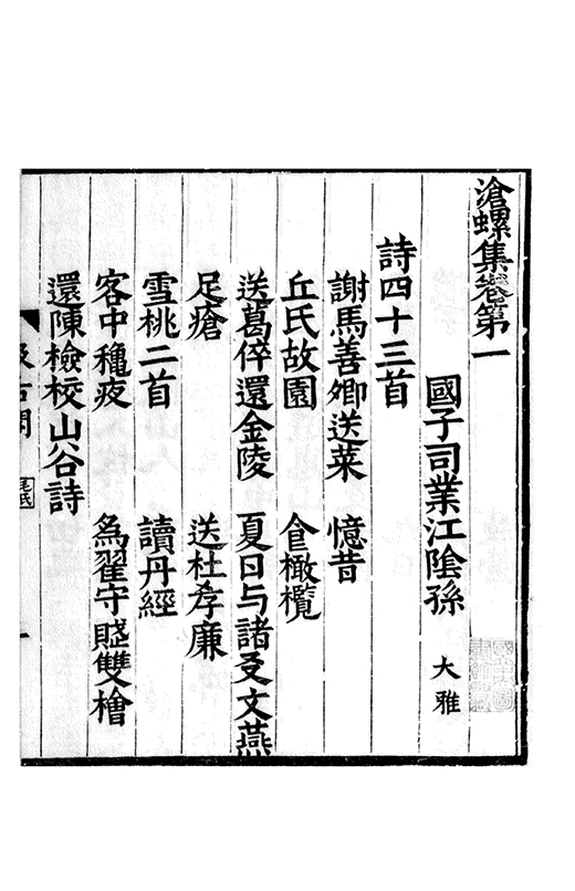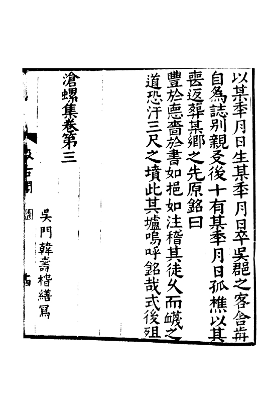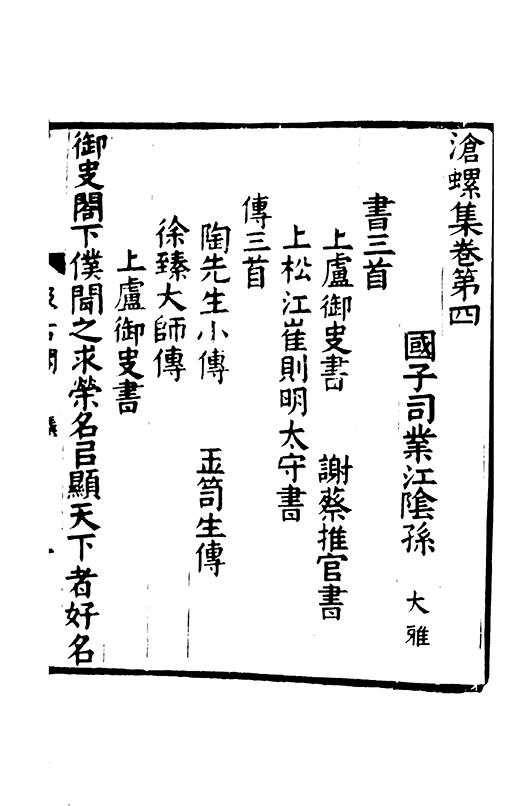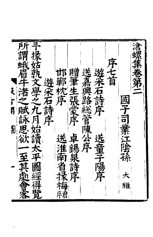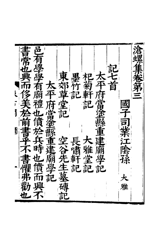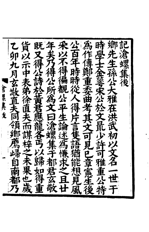 鄉先生孫公大雅在洪武初以文名一世于時學士金𦻏宋公於文最少許可雅重公特為作傳鄭重委曲考其文可見巳章憲生後公百年時時從人得片言隻語猶能想見風采以不得徧覩公平生論述為慊求之且廿年矣乃得公所為文曰滄螺集于都君玄敬既又得公詩於黄君應龍各丐以歸如得重貨以示中表弟徐直夫而謀梓之未果也歲乙卯九月玄敬直夫同領鄉薦㱕自南都乃