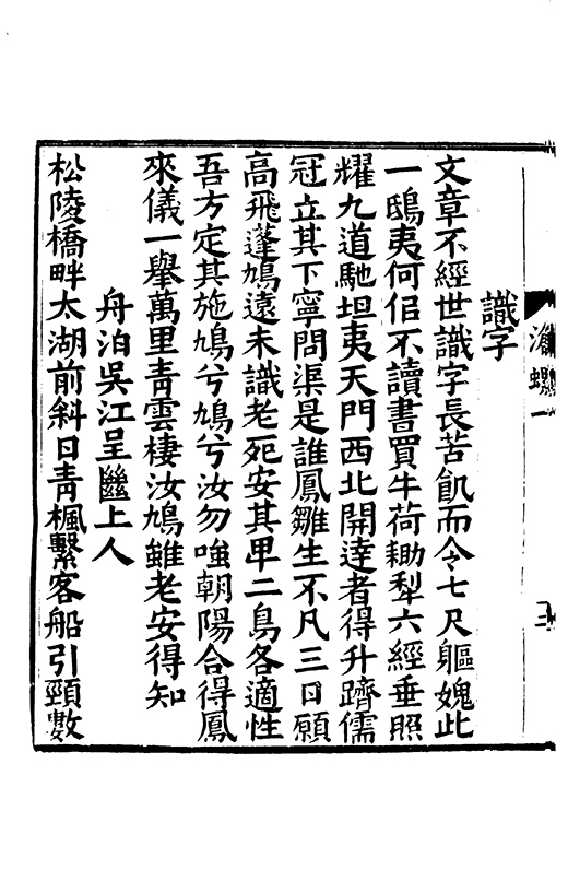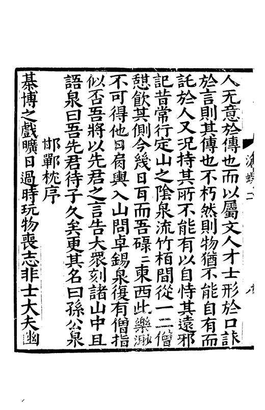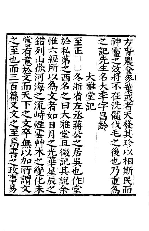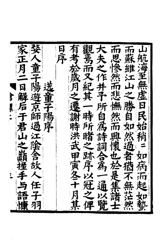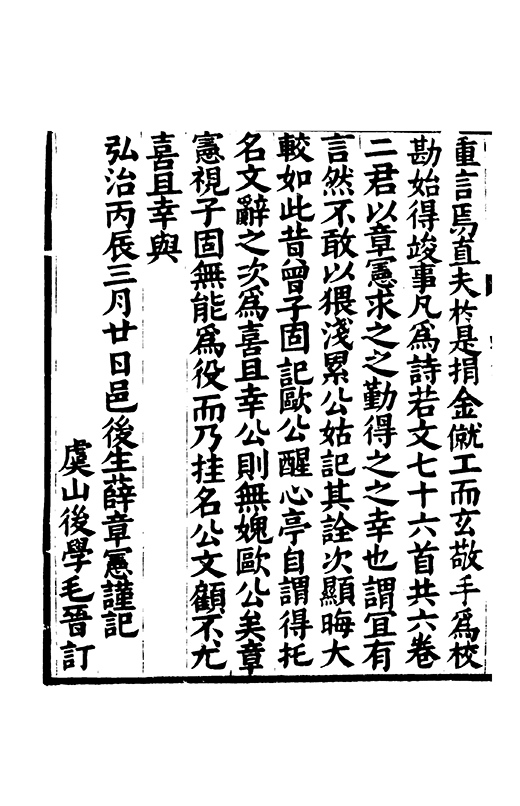 重言焉直夫於是捐金僦工而玄敬手為校勘始得竣事凡為詩若文七十六首共六卷二君以章憲求之之勤得之之幸也謂冝有言然不敢以猥淺累公姑記其詮次顯晦大較如此昔曾子固記歐公醒心亭自謂得托名文辭之次為喜且幸公則無媿歐公矣章憲視子固無能為役而乃挂名公文顧不尤喜且幸與