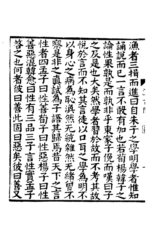 漁者三揖而進曰自朱子之學明學者惟知誦說而巳一言不敢有加也若荀揚韓子之論性果孰是而孰非乎東家子俛而嘆曰子之及是也大矣然學者習於故而不考其故悅於言而不知其言徒以口耳之學為明不以身心之病為恥渙然无統雜然无緒曾不察是非之真試為子語其歸焉昔天下之言性者四孟子曰性善荀子曰性惡揚子曰性善惡混韓愈曰性有三品三子言性實孟子啓之也何者彼曰善此固曰惡矣彼曰善又