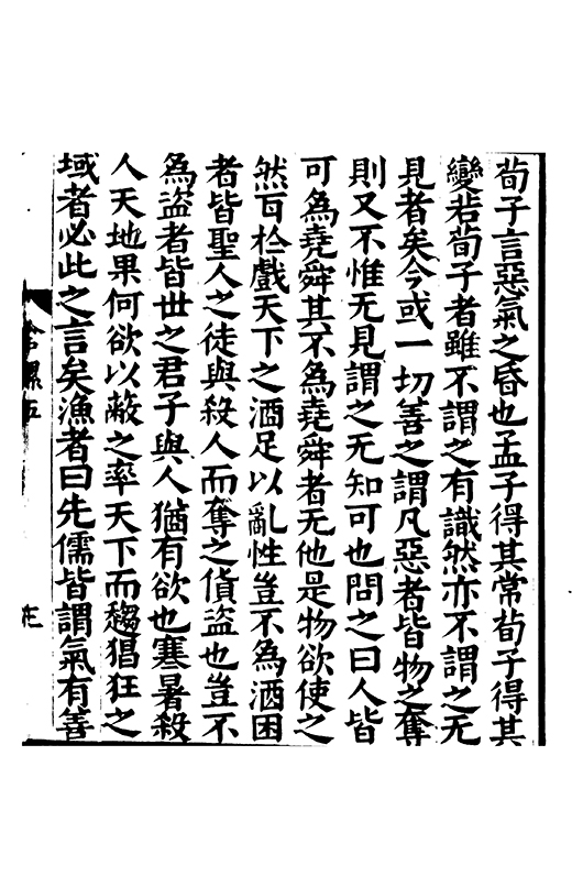 荀子言惡氣之昏也孟子得其常荀子得其變若荀子者雖不謂之有識然亦不謂之无見者矣今或一切善之謂凡惡者皆物之奪則又不惟无見謂之无知可也問之曰人皆可為堯舜其不為堯舜者无他是物欲使之然耳□戲天下之酒足以亂性豈不為酒困者皆聖人之徒與殺人而奪之貨盜也豈不為盜者皆丗之君子與人猶有欲也寒暑殺人天地果何欲以蔽之率天下而趨猖狂之域者必此之言矣漁者曰先儒皆謂氣有善