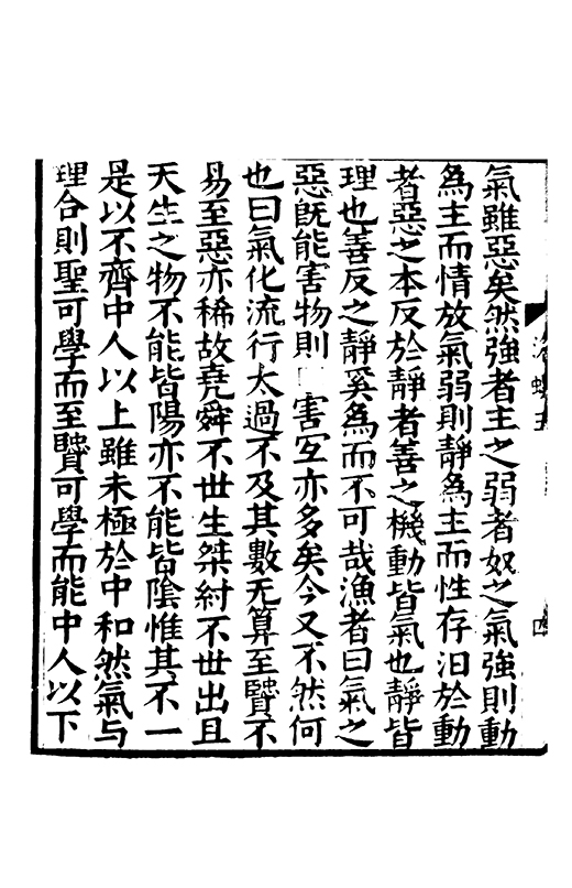 氣雖惡矣然彊者主之弱者奴之氣強則動為主而情放氣弱則靜為主而性存汨於動者惡之本反於靜者善之機動皆氣也靜皆理也善反之靜奚為而不可哉漁者曰氣之惡既能害物則□害宜亦多矣今又不然何也曰氣化流行太過不及其數无算至贒不易至惡亦稀故堯舜不丗生桀紂不丗出且天生之物不能皆陽亦不能皆隂惟其不一是以不齊中人以上雖未極於中和然氣与理合則聖可學而至贒可學而能中人以下