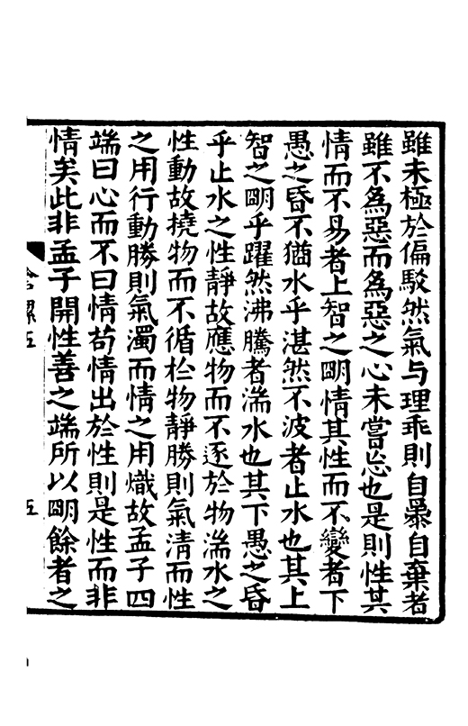 雖未極於偏駁然氣与理乖則自暴自棄者雖不為惡而為惡之心未嘗㤀也是則性其情而不易者上智之朙情其性而不變者下愚之昏不猶水乎湛然不波者止水也其上智之朙乎躍然沸騰者湍水也其下愚之昏乎止水之性靜故應物而不逐於物湍水之性動故撓物而不循於物靜勝則氣清而性之用行動勝則氣濁而情之用熾故孟子四端曰心而不曰情茍情出於性則是性而非情矣此非孟子開性善之端所以朙餘者之